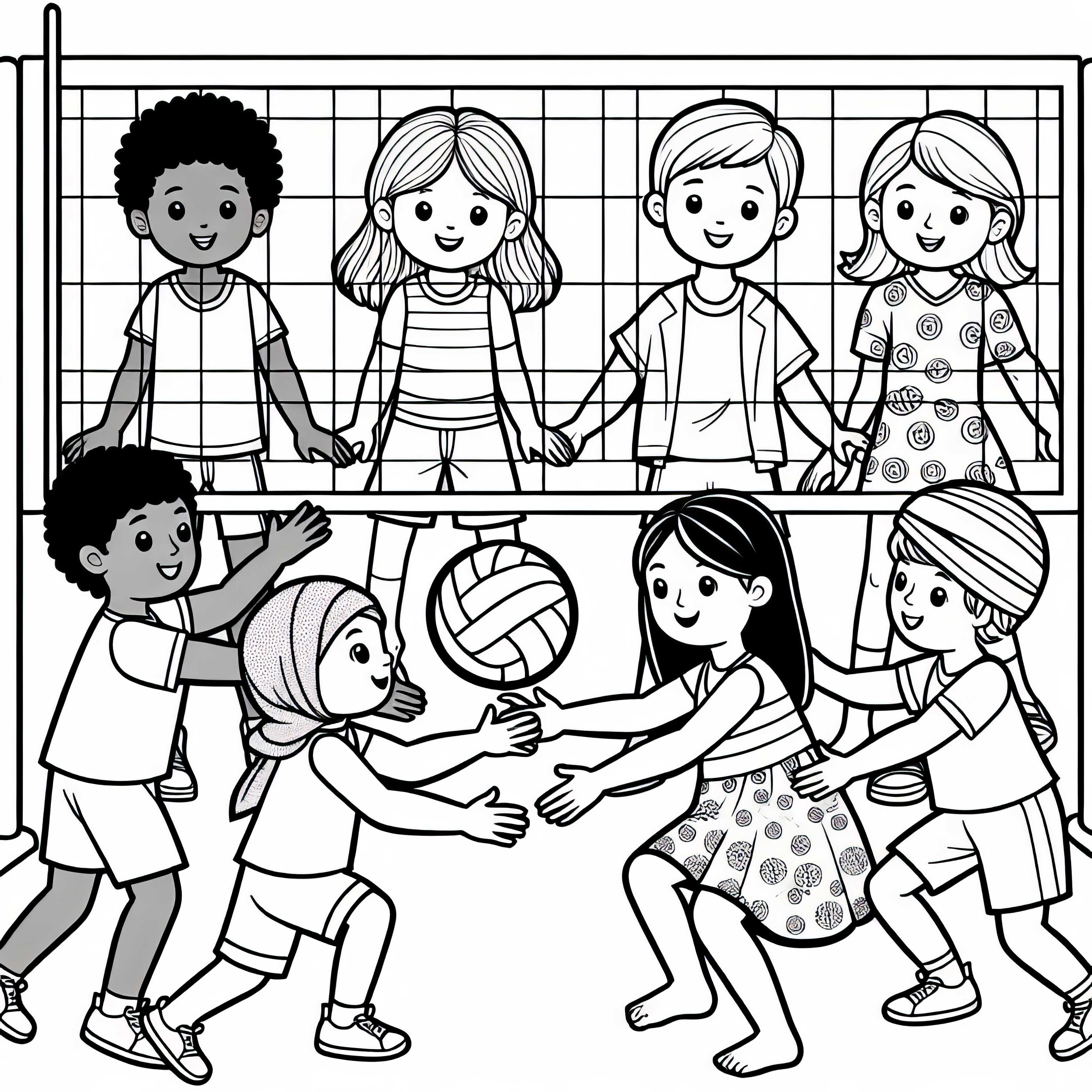 Два ребенка весело перебрасываются мячом – бесплатная раскраска