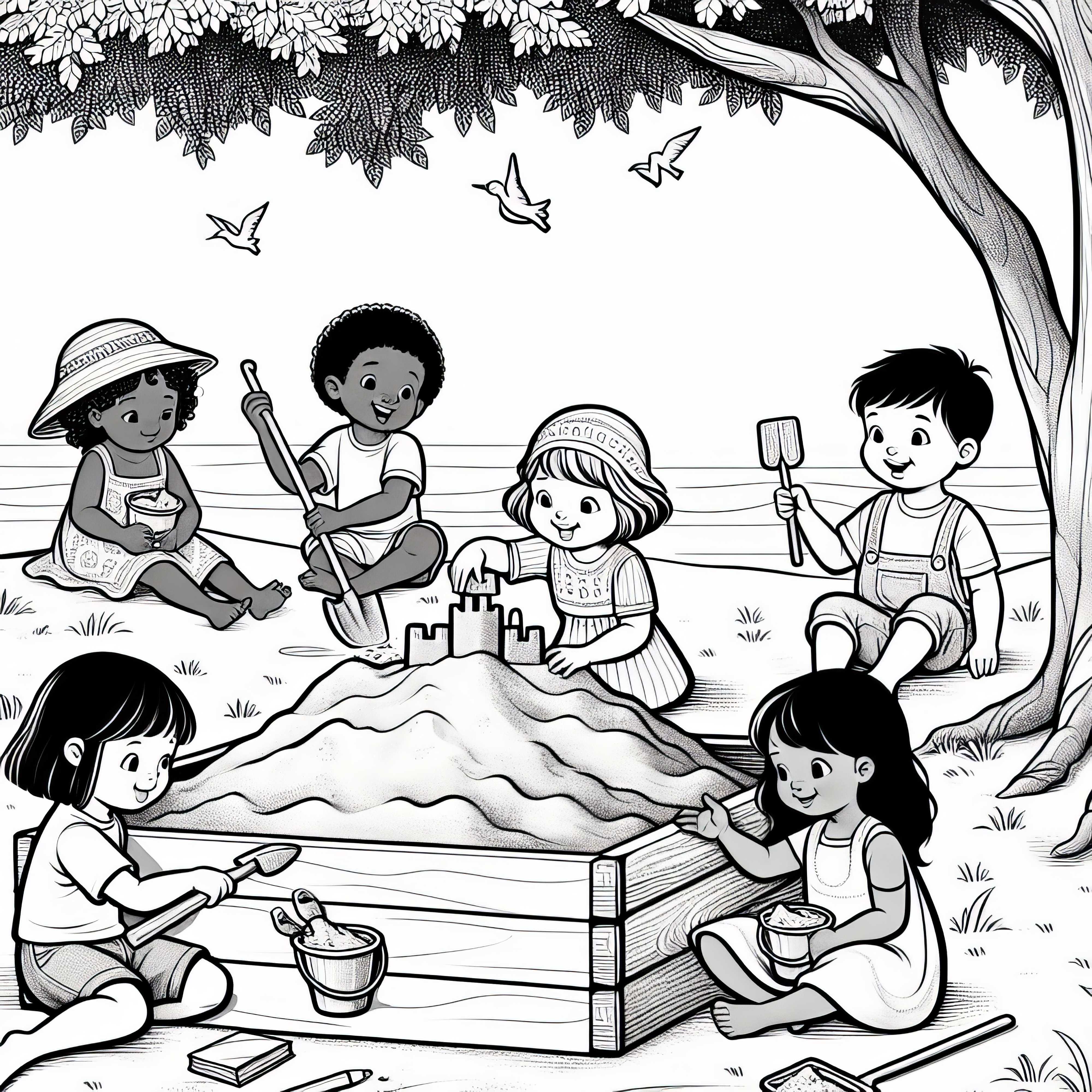 Дети лепят красивые песочные фигуры в песочнице – Бесплатная раскраска