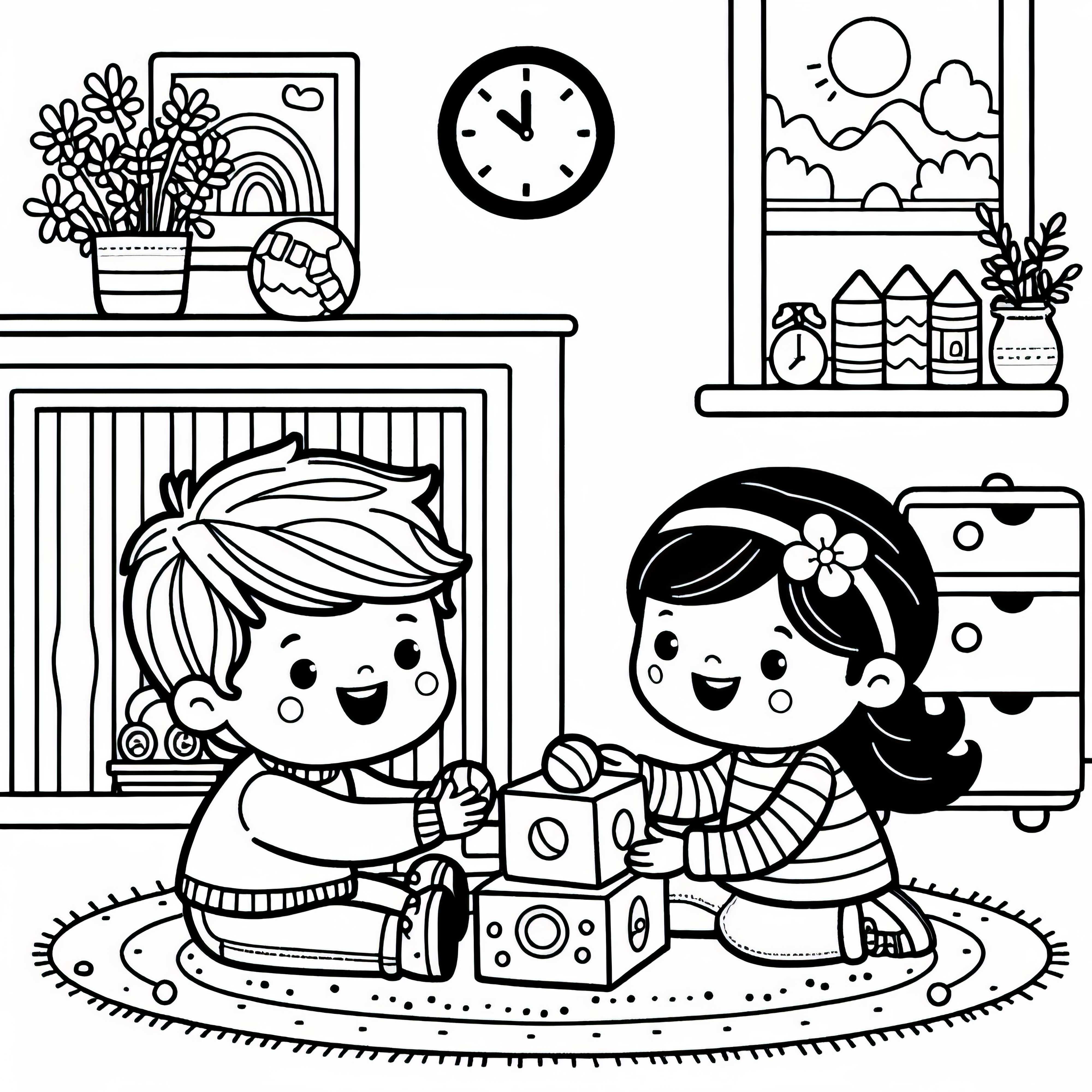 Ребёнок уютно играет с куклами в детской – Бесплатно скачать раскраску