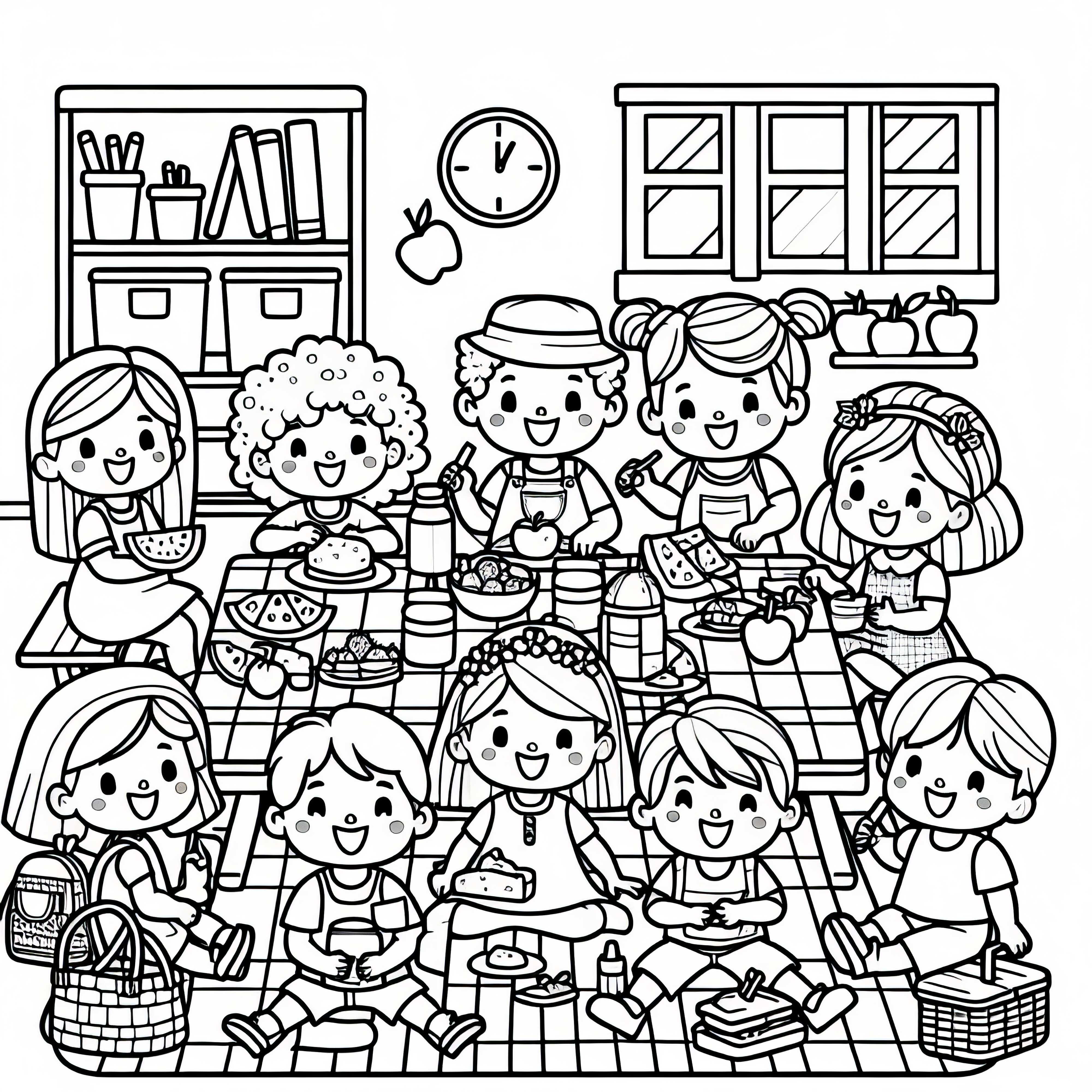 Дети читают вместе книгу с картинками в детской комнате, бесплатная раскраска