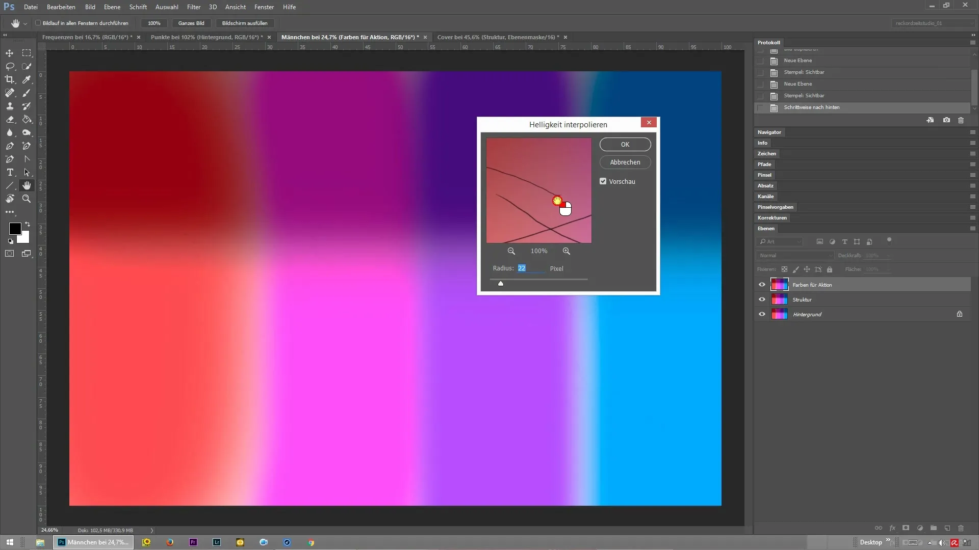 Чтобы понять эффект частотного разделения, сначала посмотрите на высокочастотные структуры вашего изображения. Увеличьте изображение и обратите внимание на детали. Вы заметите, что между цветами и структурами существуют резкие переходы. Эти некрасивые края могут быть проблемными при традиционных техниках ретуши.