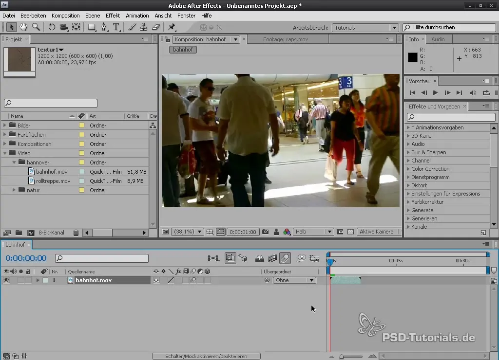 Начни с импорта своих материалов в After Effects. Перенеси выбранное видео в новую композицию. Убедись, что у тебя есть все необходимые клипы, например, клип, который ты снял в Ганновере.