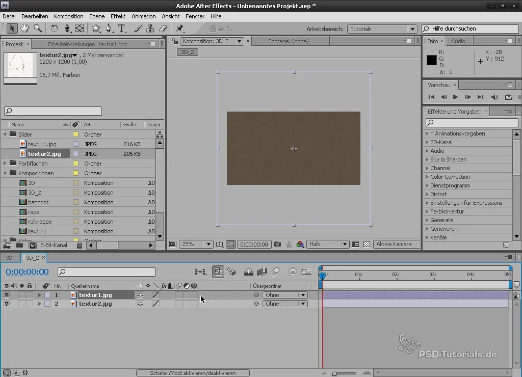 Импортируйте текстуры, которые вы хотите использовать в композиции. Активируйте также здесь 3D-куб для каждой текстуры, чтобы расположить их в пространстве. Вы можете перемещать текстовые слои на разные высоты, чтобы они появлялись на разных уровнях.