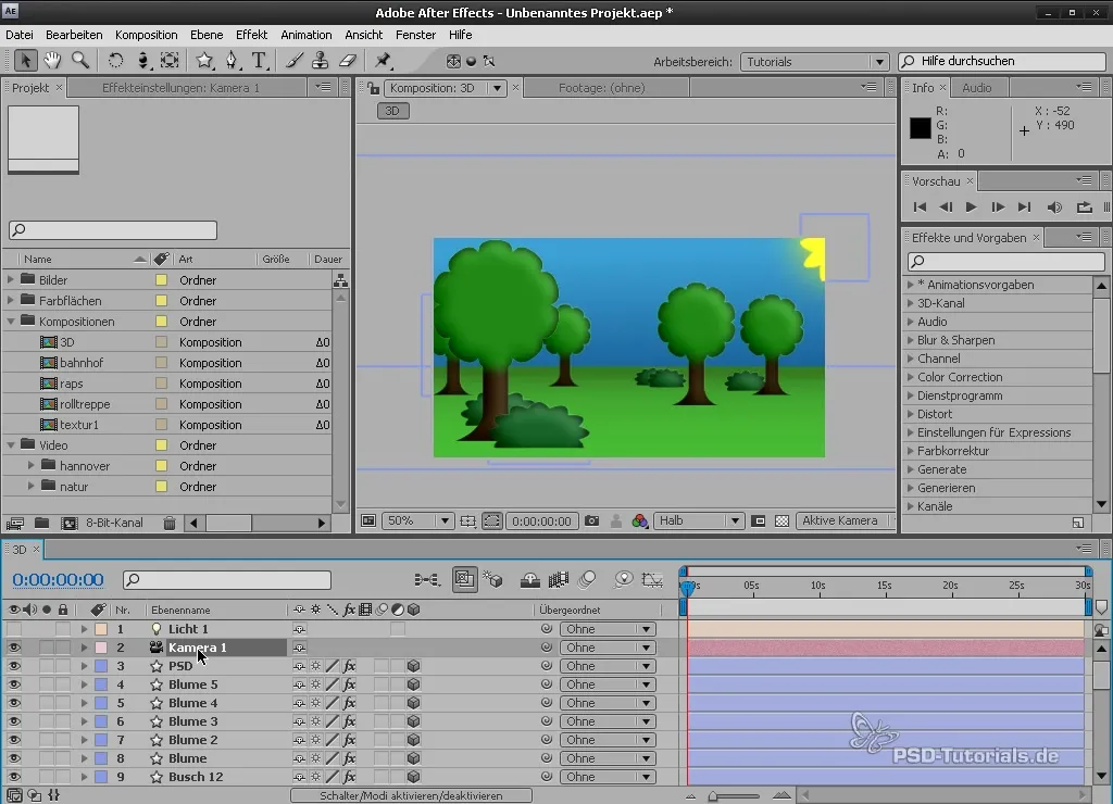 Сначала активируйте 3D-пространство, включив 3D-значок для нужных слоев. Откройте существующую композицию. Здесь вы увидите различные элементы, классифицированные как 3D-слои с помощью 3D-куба. Активируйте 3D-куб и ознакомьтесь с координатными осями, которые помогут вам изменить положение слоев в пространстве.