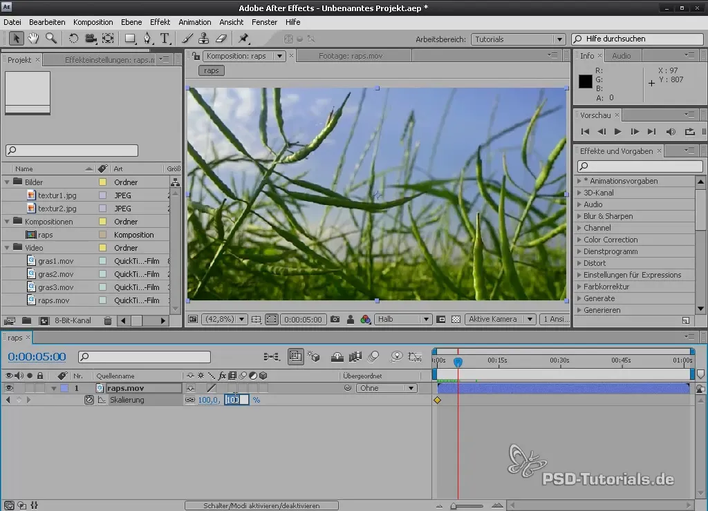 После того как вы установили первые ключевые кадры, вы можете настроить значения. Установите масштаб на 5 секунд на 20%, затем вернитесь к первоначальному значению на 8 секунде. Таким образом, вы получите простую анимацию, в которой объект уменьшается, а затем снова вырастает.