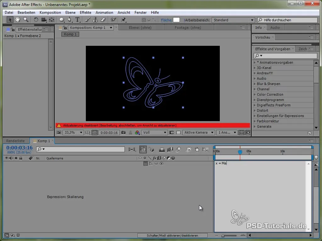Чтобы заставить нашу бабочку двигаться, сперва нужно анимировать её так, чтобы она двигалась в волне. Это волнообразное движение можно реализовать без особых усилий с помощью Expressions.