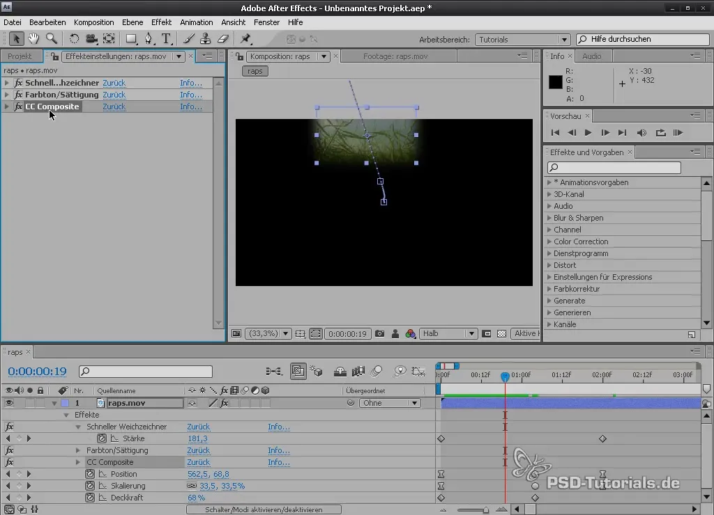 Помимо размытия вы также можете применять цветокоррекции. Выберите слой и перейдите к «Эффект», затем «Цветокоррекция». Здесь вы найдете эффект Цветовой тон/Насыщенность. Активируйте опцию «Закрашивание», чтобы внести изменения в цвета и выберите желтый или зеленоватый оттенок.