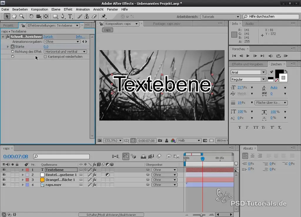 Вы также можете создавать текстовые слои и обрабатывать их с эффектами. Создайте текстовый слой и выберите шрифт и цвет. Даже быстрое размытие может быть применено к тексту.
