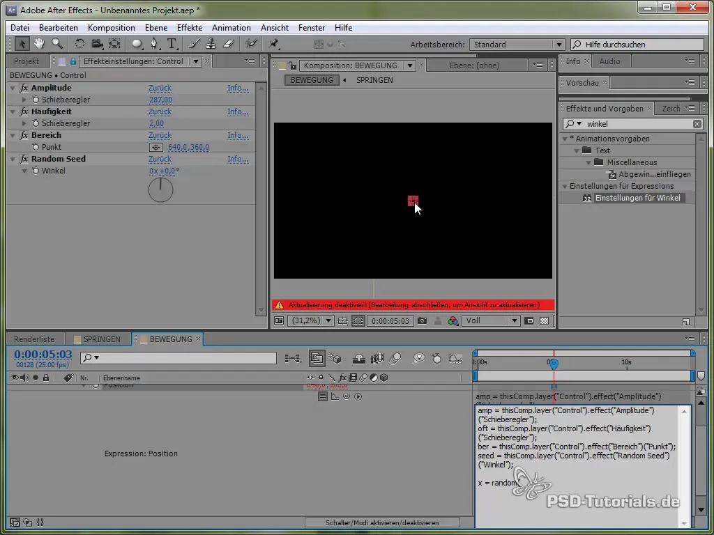 Теперь приходит захватывающая часть: добавьте выражения для случайного перемещения с помощью random! Определите диапазон, в пределах которого значение будет генерироваться случайным образом. Например, вы можете установить диапазон от -Диапазон/2 до Диапазон/2, чтобы захватить высоту и ширину прыжков.