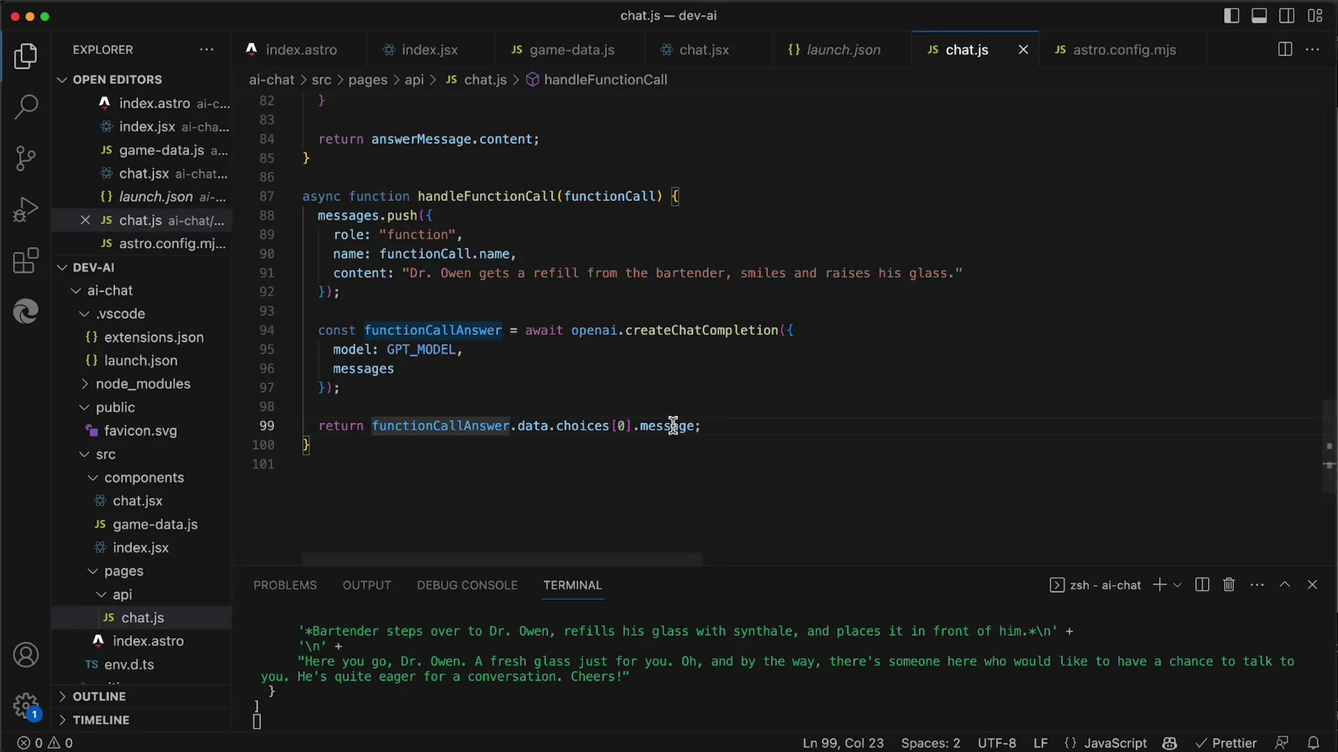 Začneme vytvorením našej funkcie HandleFunctionCall. Táto funkcia prijíma podobjekt volania funkcií z odozvy správy. Tento prenos je prvým krokom k získaniu kontroly nad odozvou IA a spracovaniu správy podľa nej.