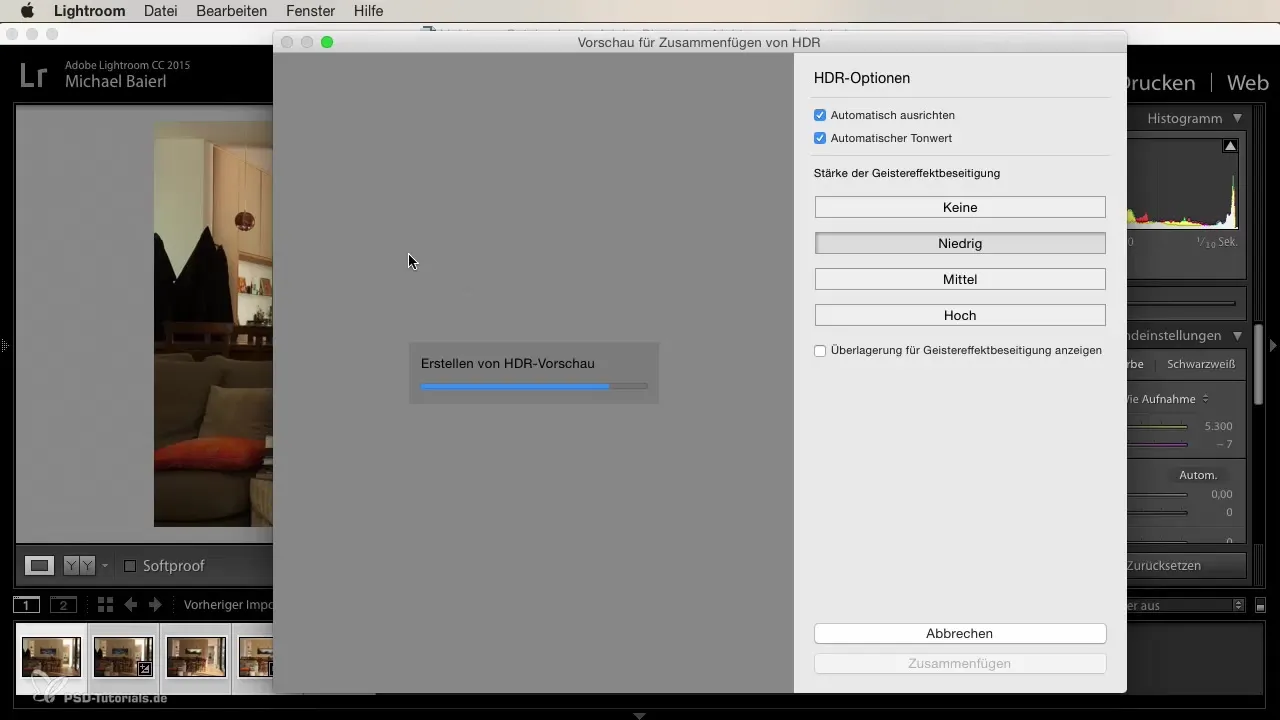 V HDR dialógovom okne môžeš nastaviť rôzne možnosti. Aktivuj automatické zarovnanie, aby si opravili minimálne posuny medzi obrázkami. Ak tvoja kamera nebola počas snímania stabilne držaná, pomôže to dosiahnuť najlepšie výsledky.
