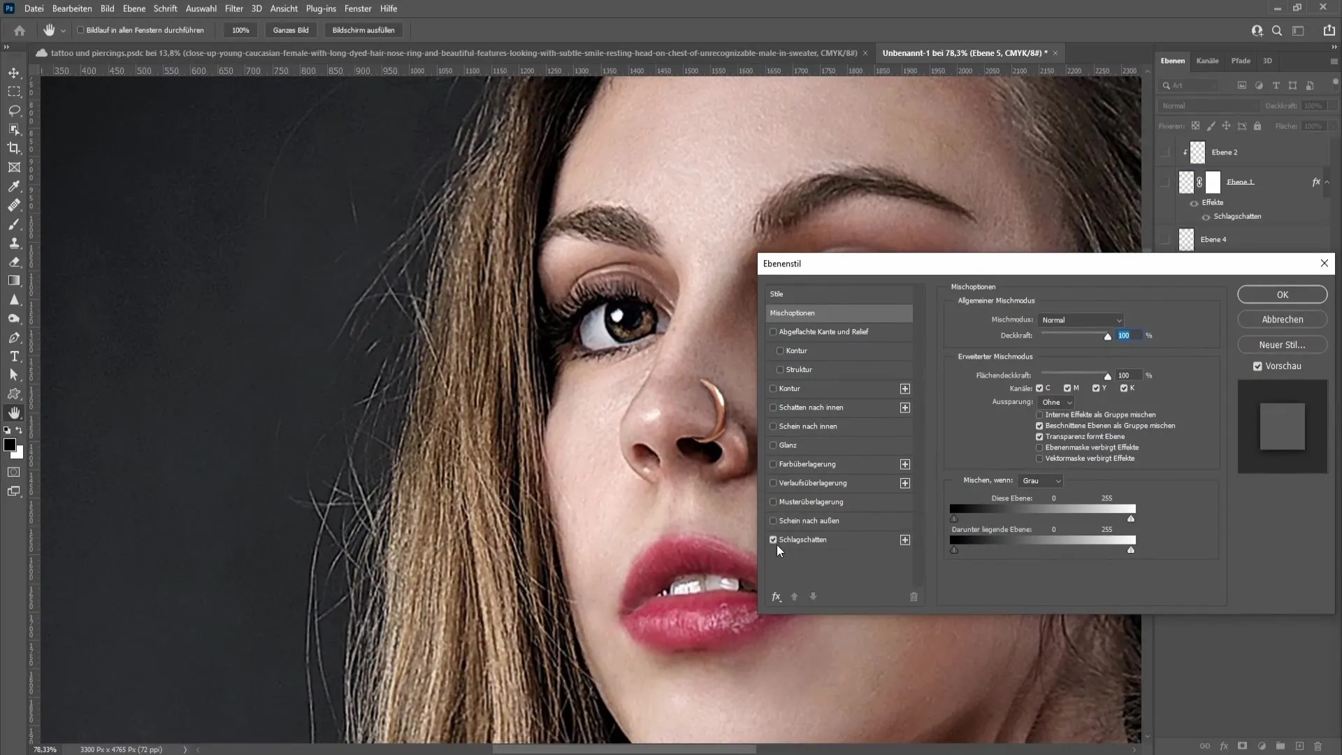 Piercingový krúžok stále vyzerá dosť plocho. Aby bol realistickejší, pridáme teraz tieň. Kliknite pravým tlačidlom myši na vrstvu piercingu a vyberte položku "Možnosti výplne". Aktivujte možnosť "Drop Shadow" (Kvapkový tieň) a upravte nastavenia tak, aby ste vytvorili jemný tieň, ktorý zdvihne piercing a vytvorí 3D efekt. Je dôležité nenastaviť príliš vysoké krytie, aby tieň vyzeral prirodzene a nepôsobil príliš rušivo.