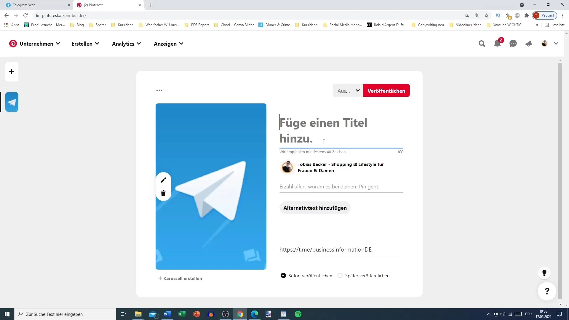 Teraz si upravíš svoj profil na Pintereste. Chceš nahrať obrázky, alebo takzvané "piny". Tieto piny sú porovnateľné s obrázkami na Instagrame, ale existuje niekoľko rozdielov, na ktoré treba pamätať. Máš možnosť pridať popis, názov a odkaz na svoju skupinu na Telegramu.