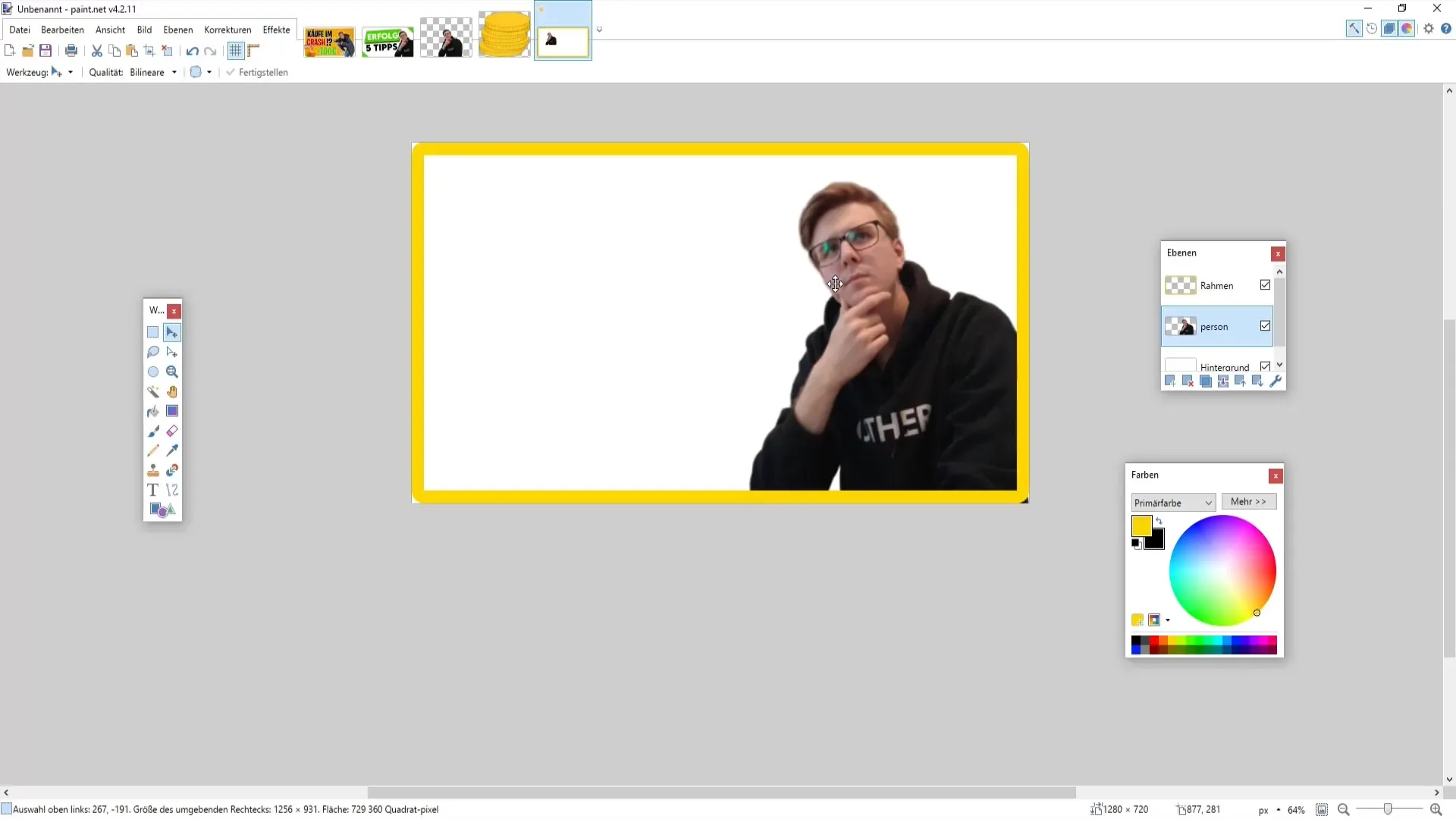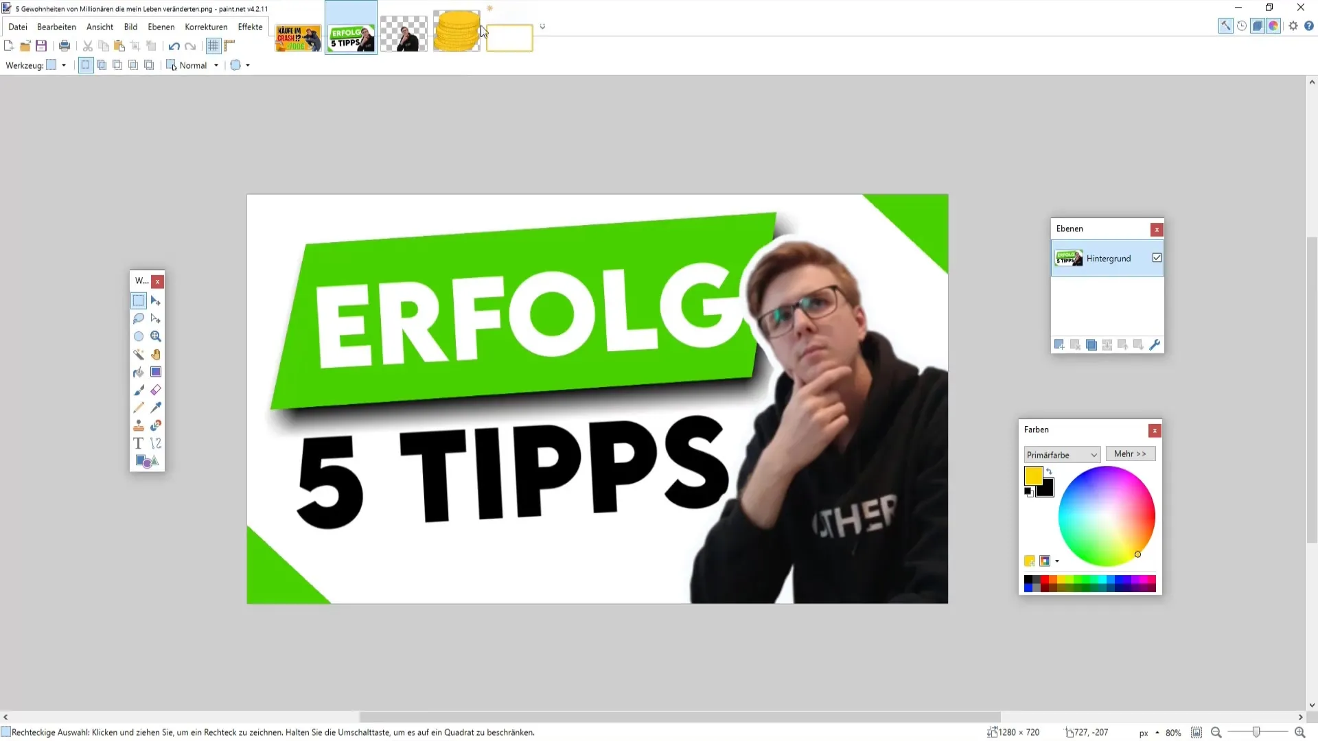 Teraz pristúpte k formátovaniu pozadia vášho náhľadu. Môžete použiť obrázky z internetových zdrojov. Otvorte požadovaný obrázok v Paint.NET a vložte ho do svojho projektu. Dajte pozor, aby vaše rohy zostali voľné, aby sa náhľad dobre prezentoval pri zobrazení na YouTube.