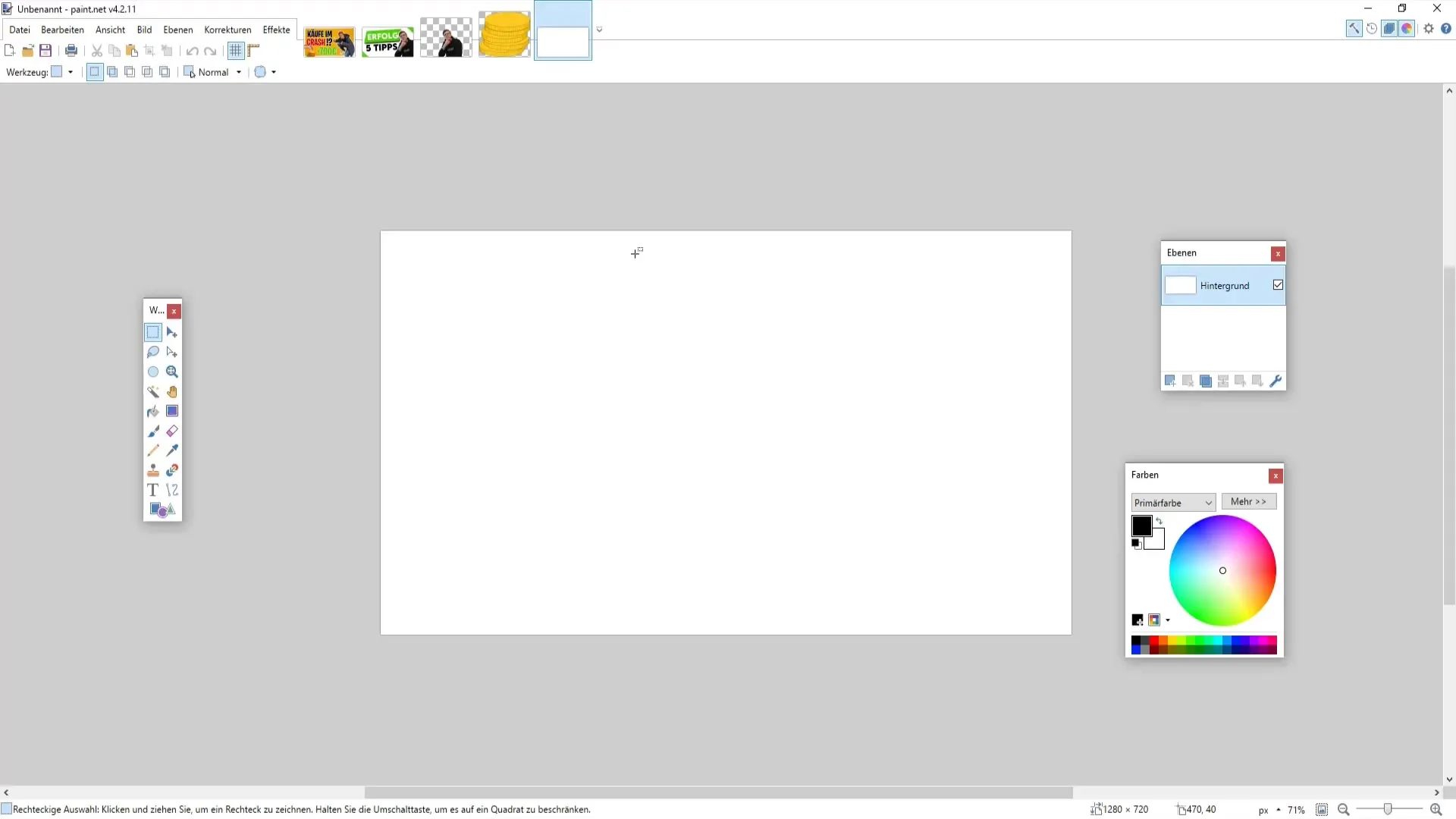 Začnite tým, že určíte optimálnu veľkosť vášho náhľadu. Kliknite v Paint.NET na symbol plus, vyberte možnosť "Nový obrázok" a zadajte rozmery 1280 x 720 pixelov. To je štandardná veľkosť náhľadu pre YouTube.