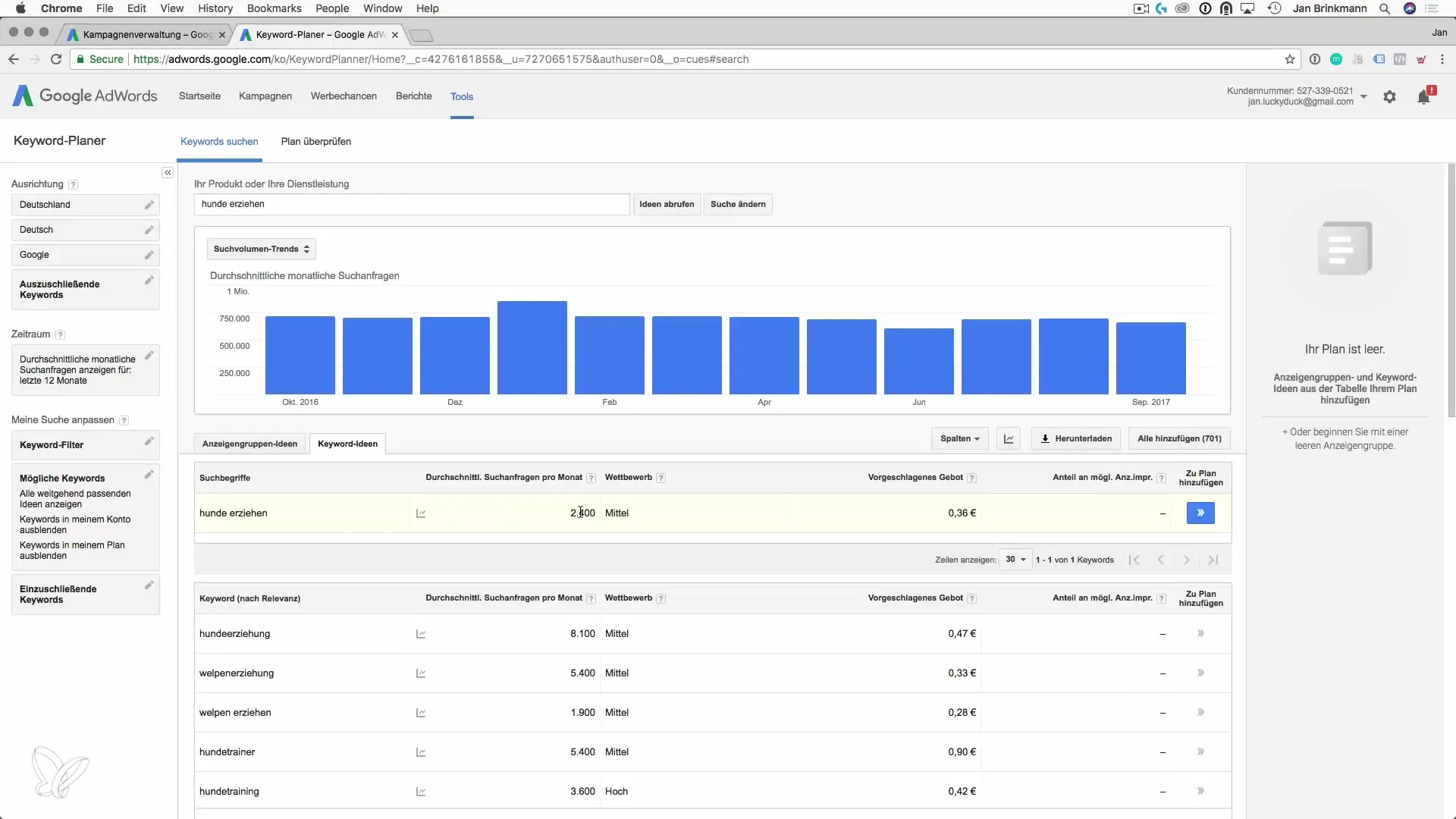 Využi Plánovač kľúčových slov na nájdenie vhodných kľúčových slov, ktoré by potenciálni zákazníci mohli používať na hľadanie tvojich služieb alebo produktov. Zadaj do Plánovača kľúčových slov relevantnú frázu, ako napríklad „Výchova psov“, aby si zistil, ktoré súvisiace kľúčové slová by mohli vzbudzovať záujem. Kľúčové slovo ako „Výchova psov“ môže mať 2400 mesačných vyhľadávaní, čo je pre tvoju stratégiu cenné.