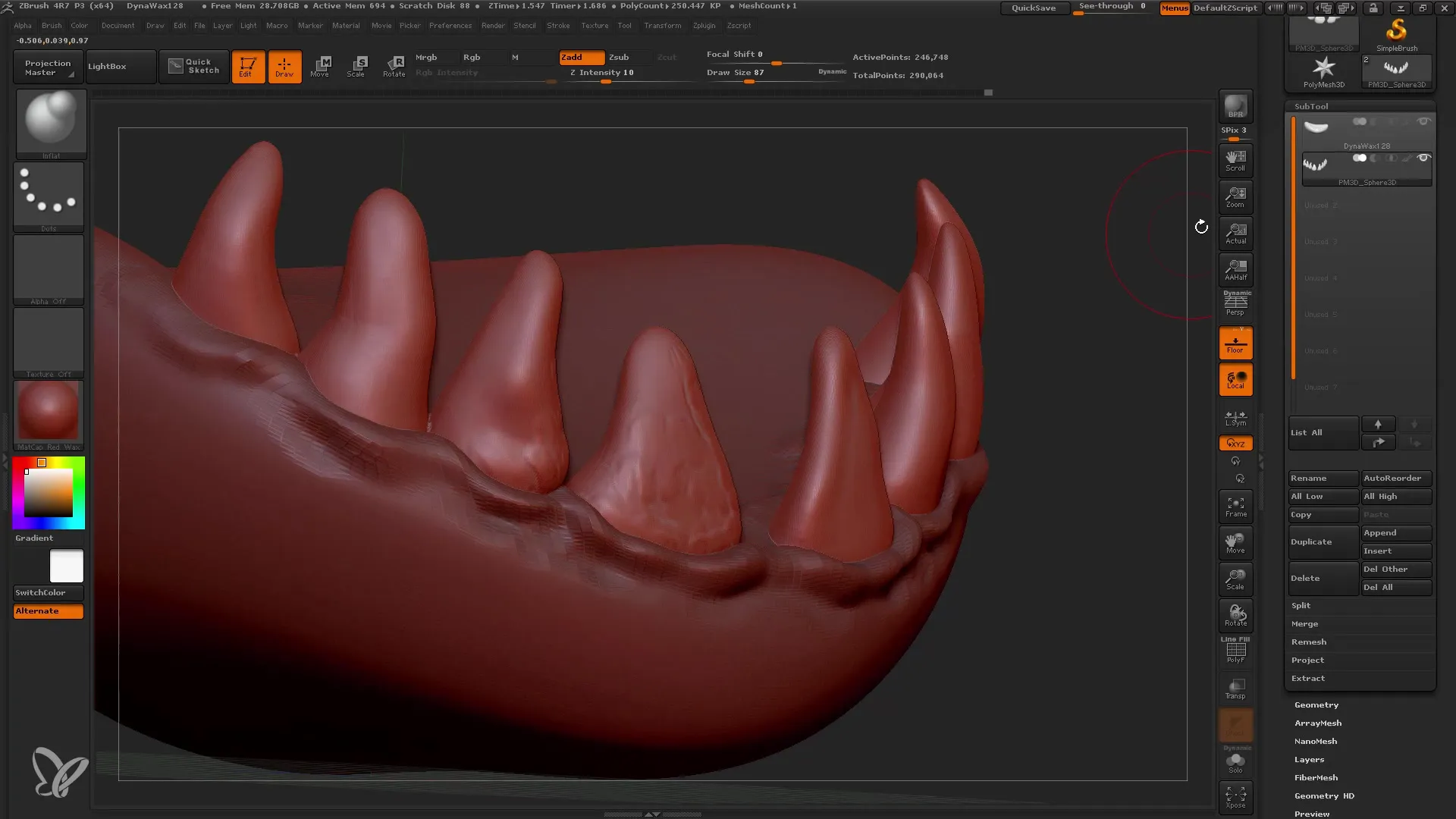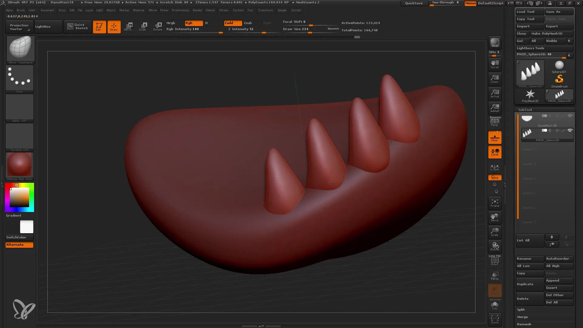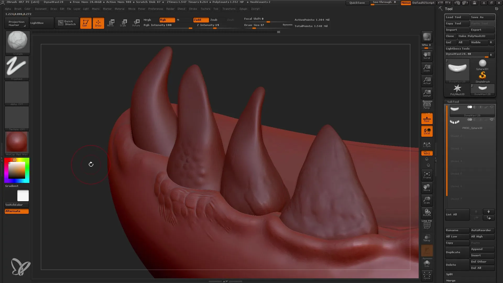 Po ustvaritvi osnovne oblike čeljusti in zob lahko začnete uporabljati Standard Brush. Ta čopič ponuja številne možnosti za detajliranje in je odličen za prehod od osnovnih k podrobnejšim modelom.