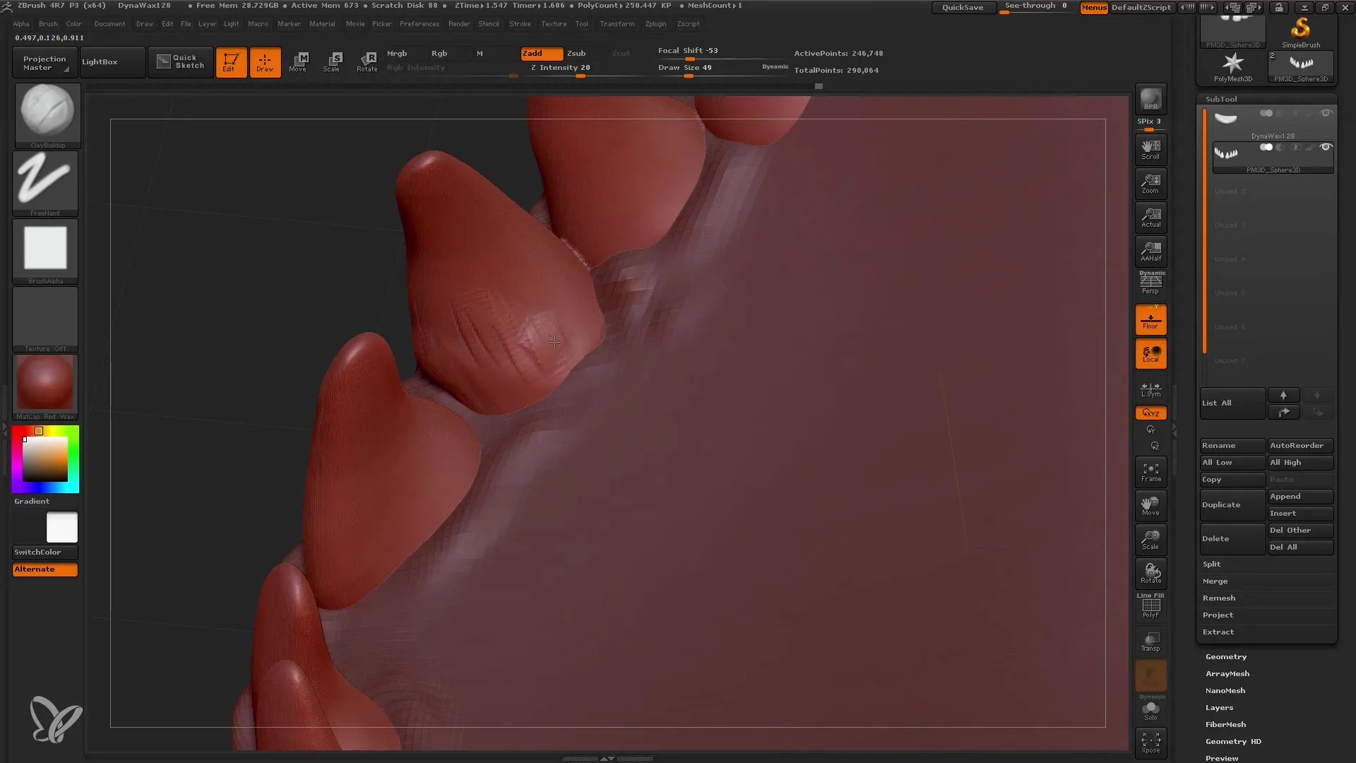 Uporabite čopič Blob za ustvarjanje drobnih podrobnosti, kot so nepravilnosti ali mehurčki na dlesni. Poskrbite, da nastavite ustrezno ločljivost za mrežo, da dosežete najboljše rezultate.