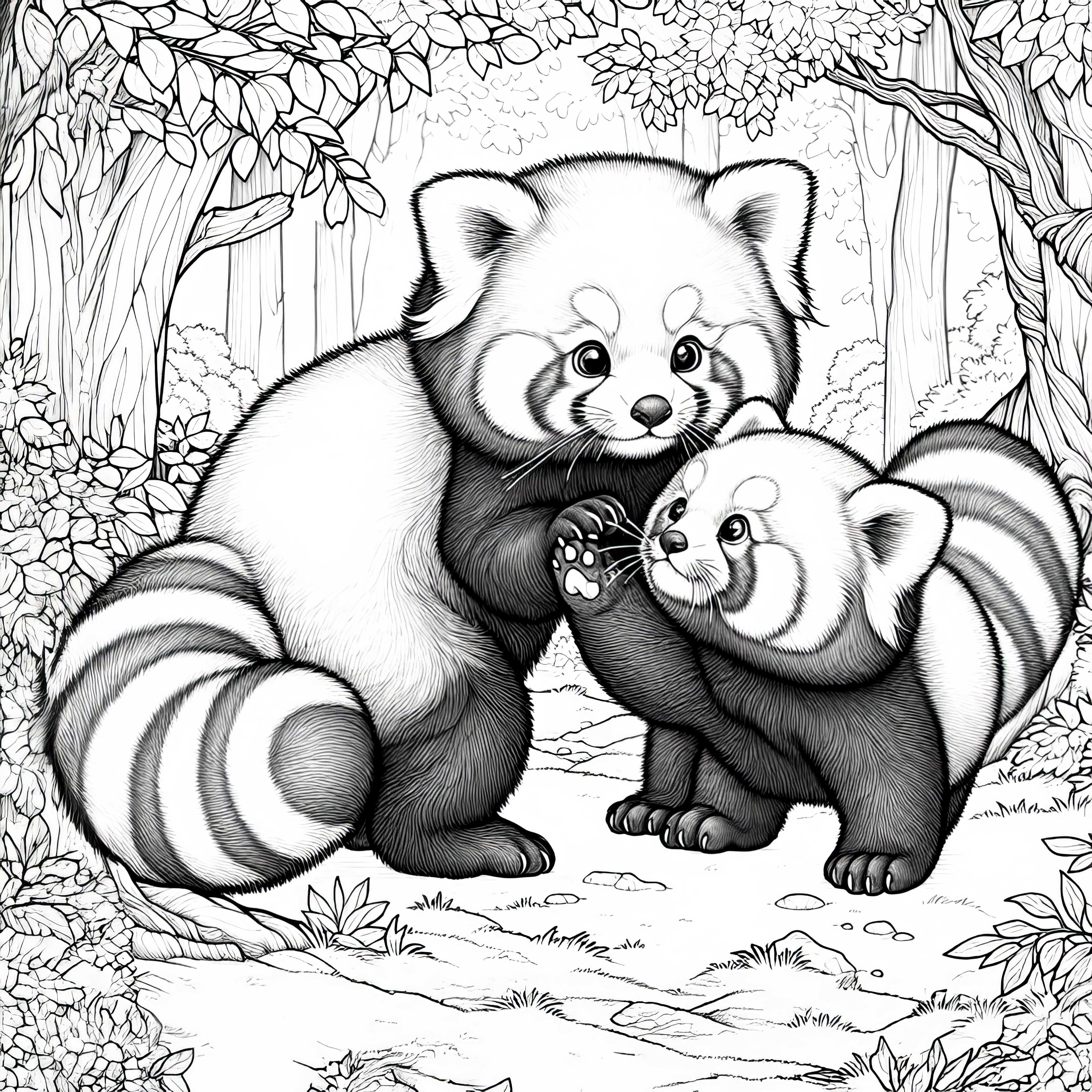 Två röda pandor leker tillsammans i skogen – detaljerad målarbild gratis