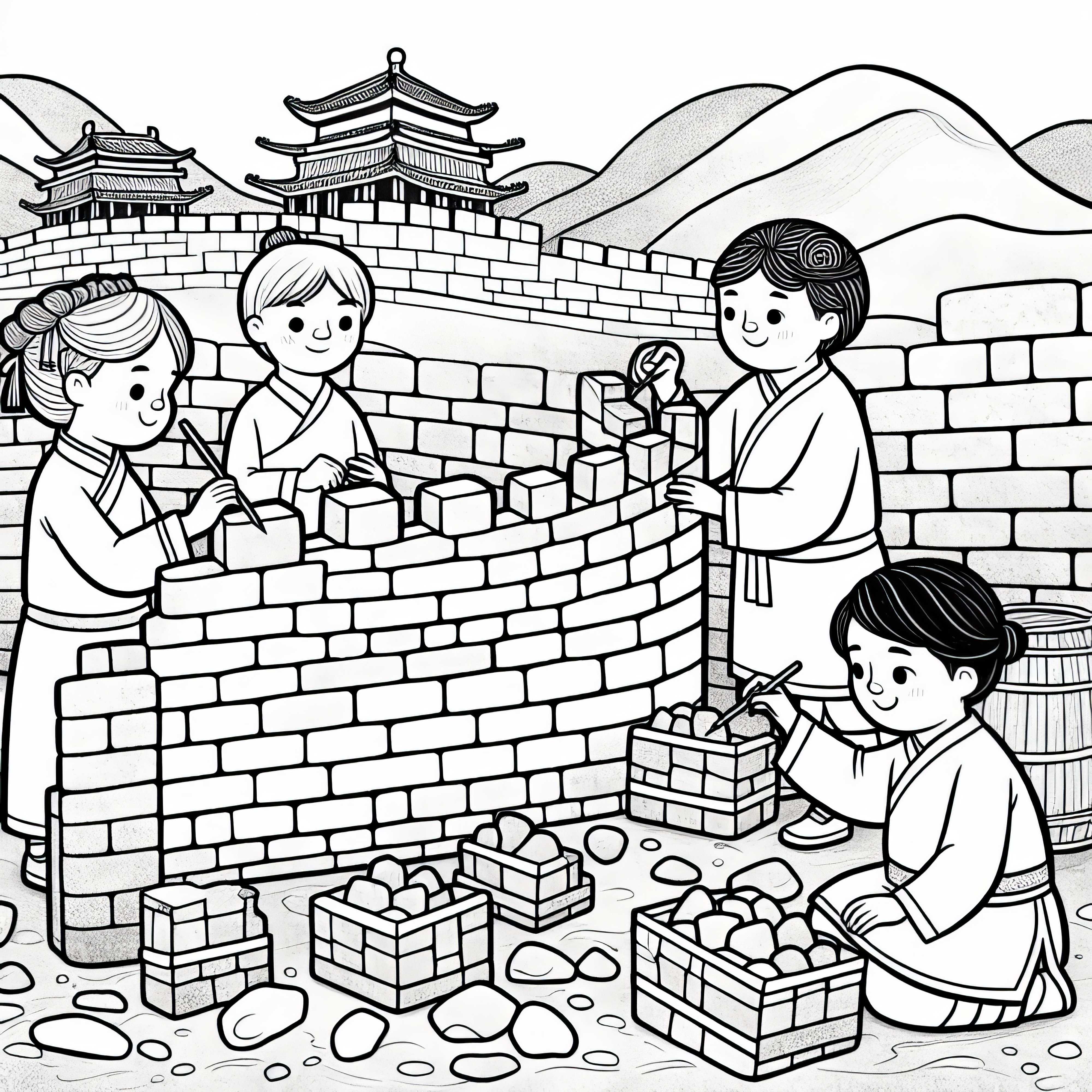 På denna färgläggningsbild ser du barn som bygger en liten modell av den imponerande Kinesiska muren av stenar. Denna scen för dig direkt in i det fascinerande antika Kina. Bildet är utmärkt för kreativa färgläggningsprojekt, oavsett om du vill skriva ut det eller färglägga online. Det bästa av allt: Färgläggningsbilden är tillgänglig för dig gratis. Ladda ner färgläggningsbilden nu och dölj dig in i historien!