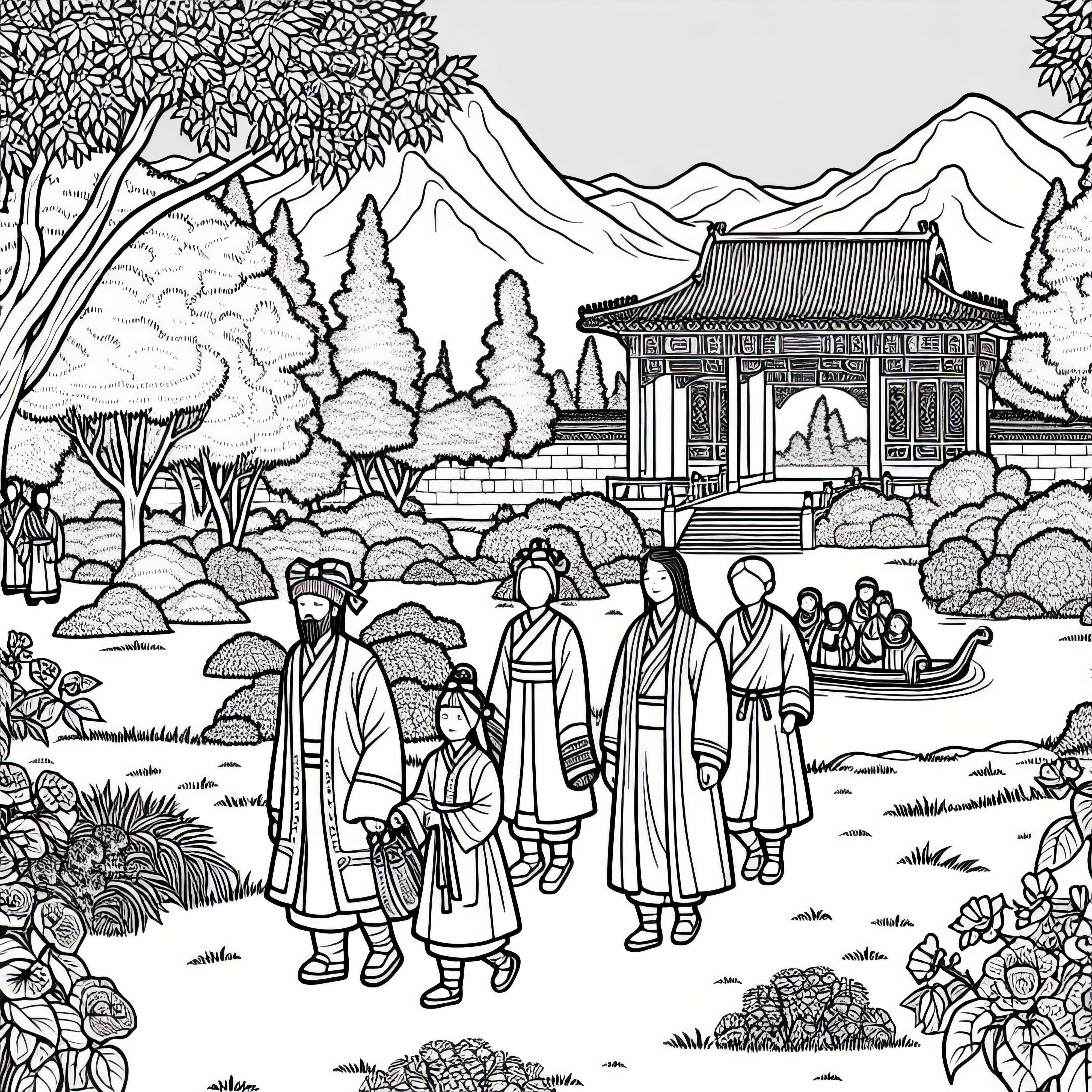 I denna lugna trädgårdsanläggning från det gamla Kina ser du en harmonisk scen med människor som njuter av naturen när de promenerar. Bilden förmedlar en känsla av lugn och inbjuder till kreativitet. Du kan enkelt ladda ner denna målarbild gratis och använda den. Dessutom är den också tillgänglig online så att du kan prova dina färger direkt på skärmen. Ladda ner målarbilden nu och upptäck glädjen i att färglägga!