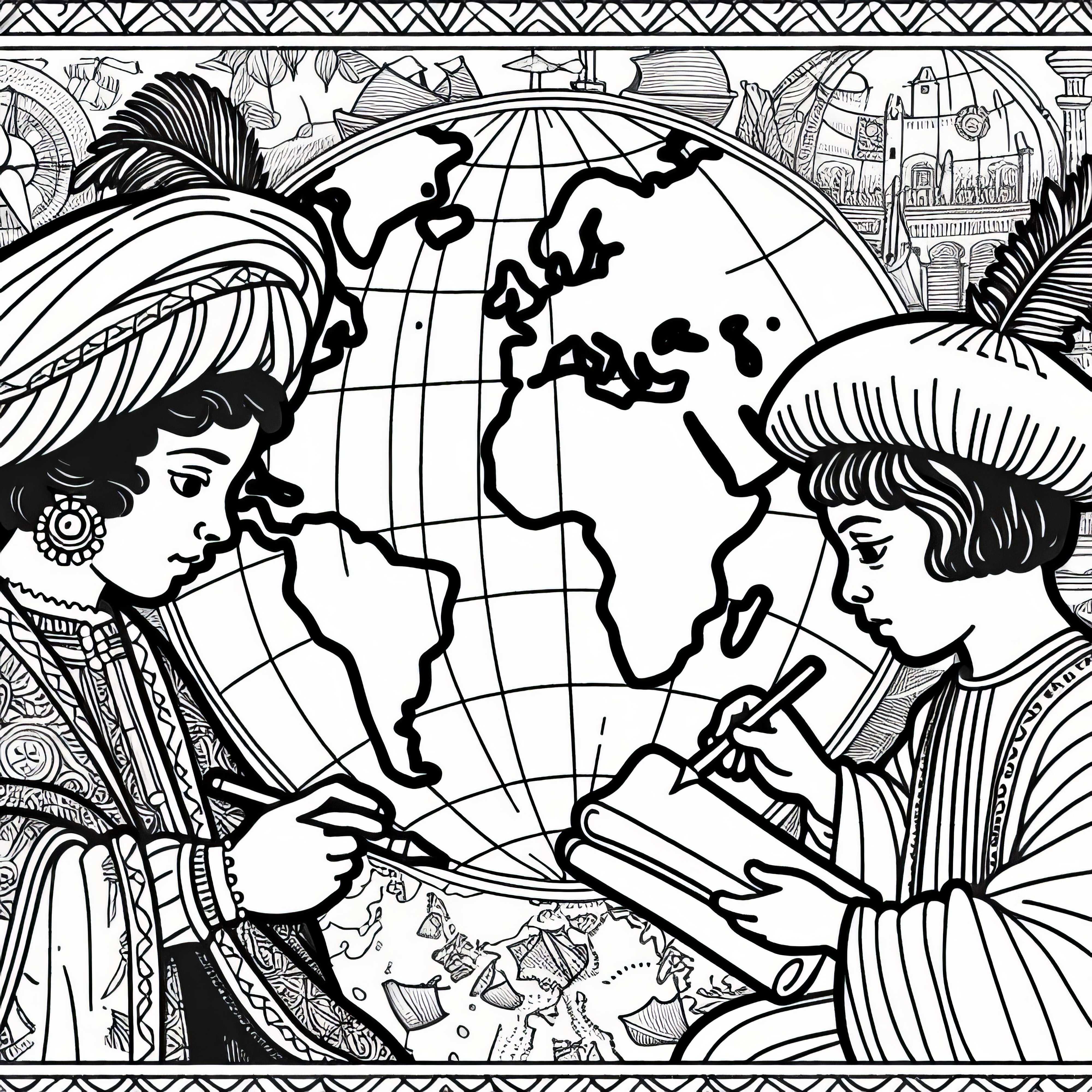 I denna målarbild ser du en fascinerande världskarta som tar dig tillbaka till Spaniens gyllene tid. Du kan arbeta med starka färger för att återge de olika länderna och haven och framhäva de geografiska egenskaperna. Typiska färger för färgläggning kan vara guld- och blå nyanser för att reflektera prakt och de outtröttliga resorna av spanska upptäcktsresande. Glöm inte att du kan få bilden kostnadsfritt – den finns i JPG-format och är idealisk för utskrift och färgläggning. Om du föredrar att färglägga digitalt, är också det enkelt möjligt.
