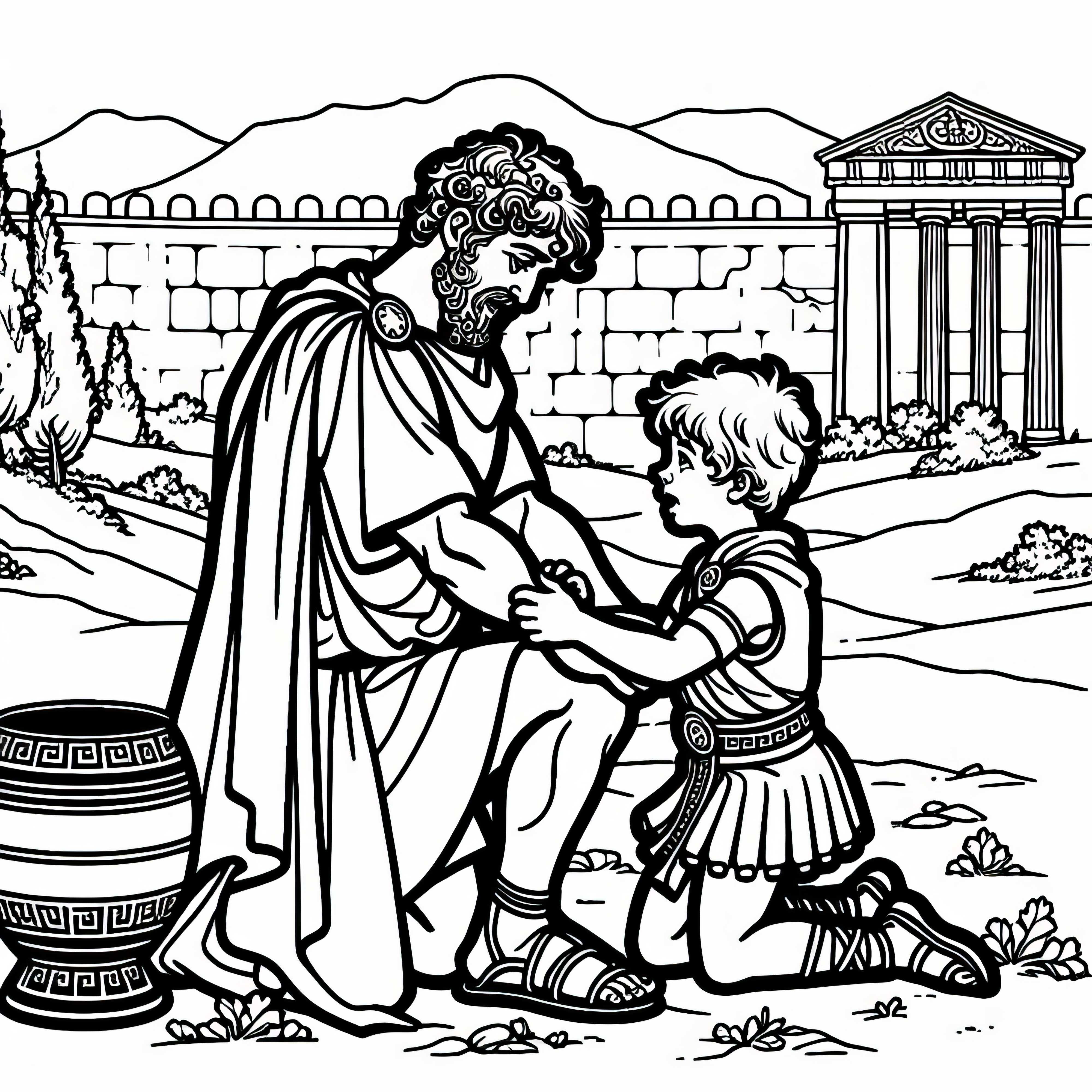 Barn lyssnar på barder som berättar om hjältedåden av Achilles och Hektor – Målarbok Ilias gratis