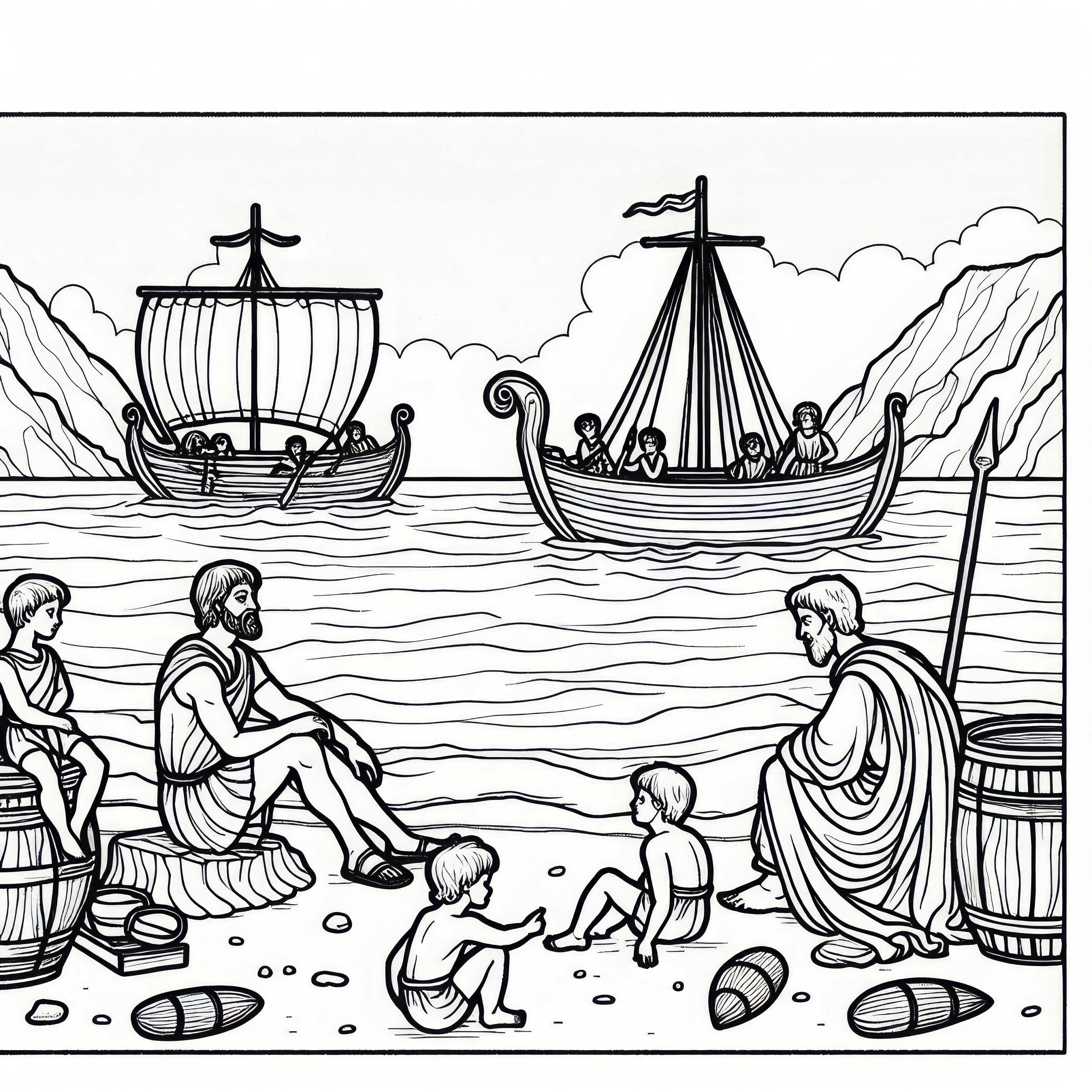 Barn lyssnar på barder som berättar om hjältedåden av Achilles och Hektor – Målarbok Ilias gratis