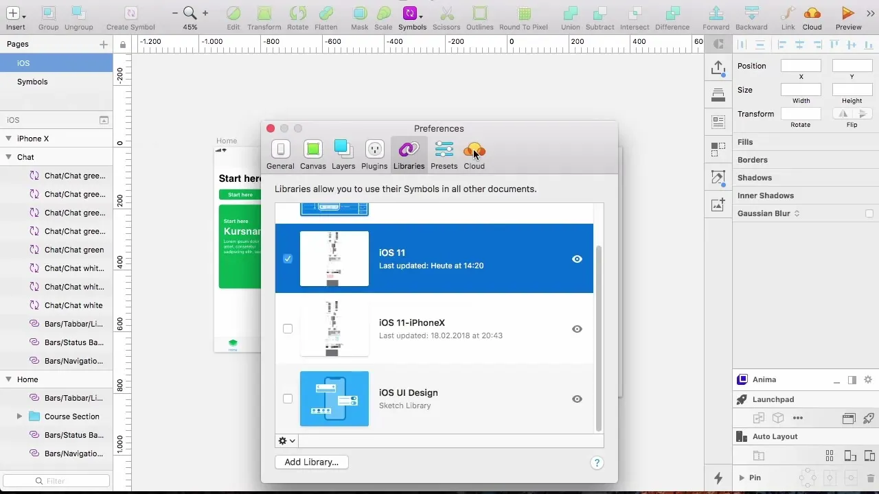 Kopiera Home Controller och anpassa designen. Det är klokt att inte använda standardbiblioteken, utan den specifika iPhone X-biblioteket för en mer exakt anpassning. Gå till inställningarna i Sketch och aktivera iOS 11-biblioteket om det inte redan är aktiverat.