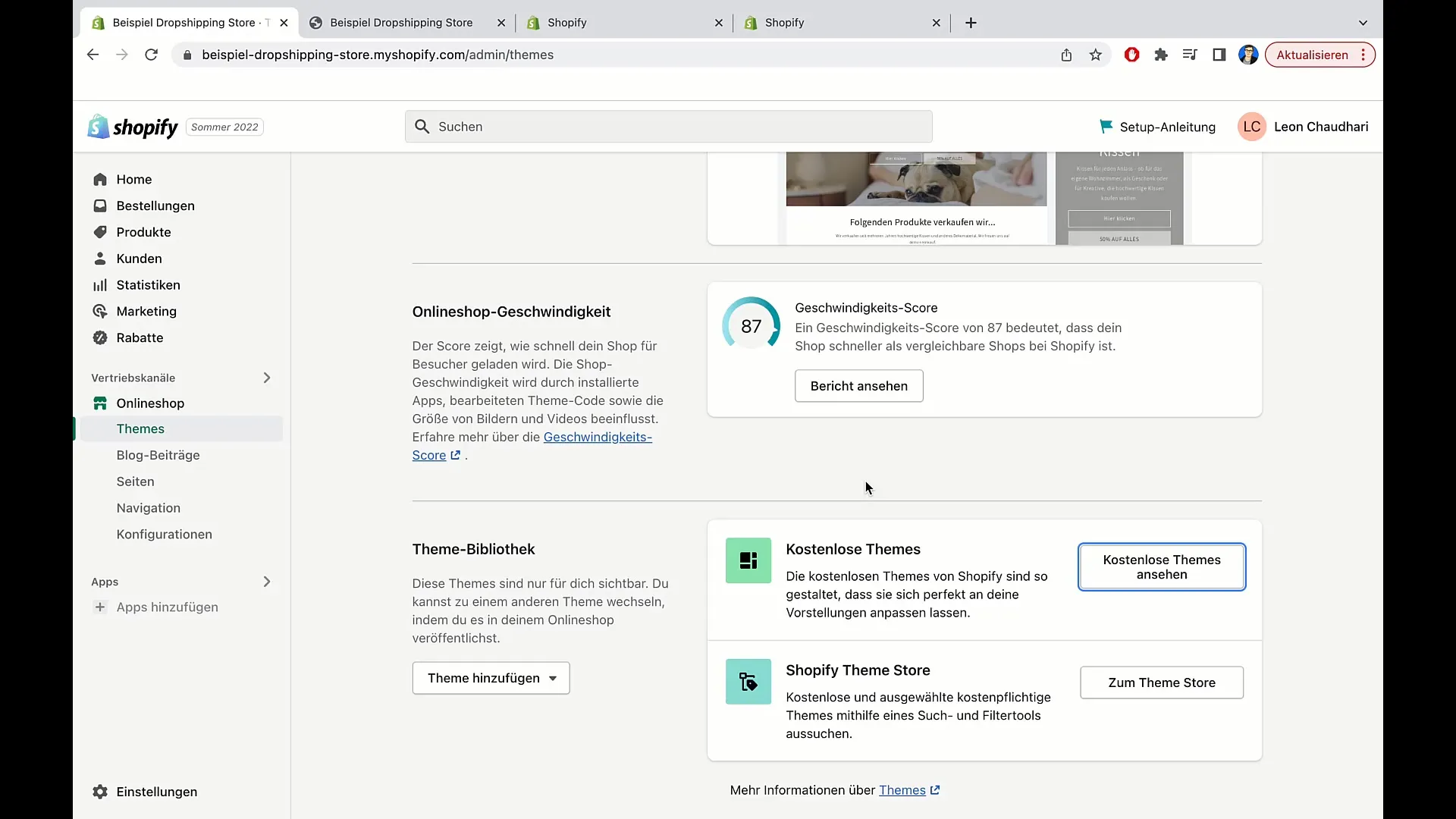 Efter att ha klickat på Försäljningskanaler ser du olika underpunkter. Klicka på "Online Shop" för att få tillgång till temahanteringen.