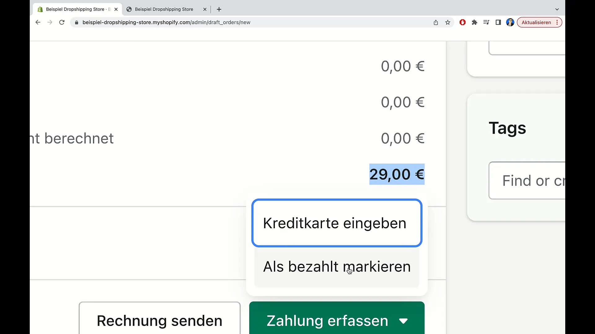 Nu måste du registrera betalningen. Klicka på "Registrera betalning". Här kan du ange om kunden redan har betalat eller om du vill lägga till hans kreditkortsuppgifter. I vårt exempel antar vi att kunden redan har betalat. Klicka på motsvarande alternativ för att markera beställningen som betald.