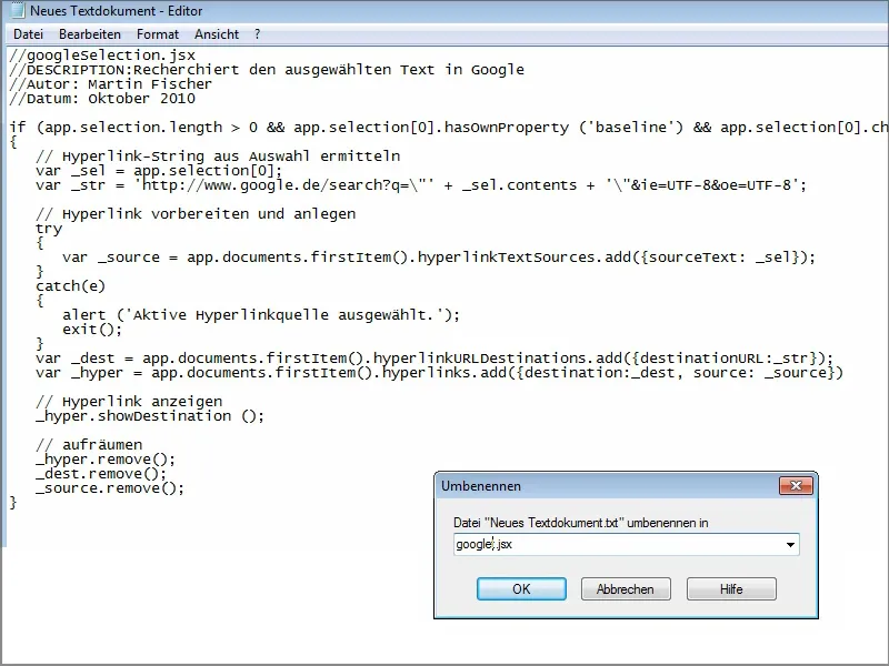 … och klistrar in koden här. Jag stänger dokumentet och döper det sedan till "google.jsx".