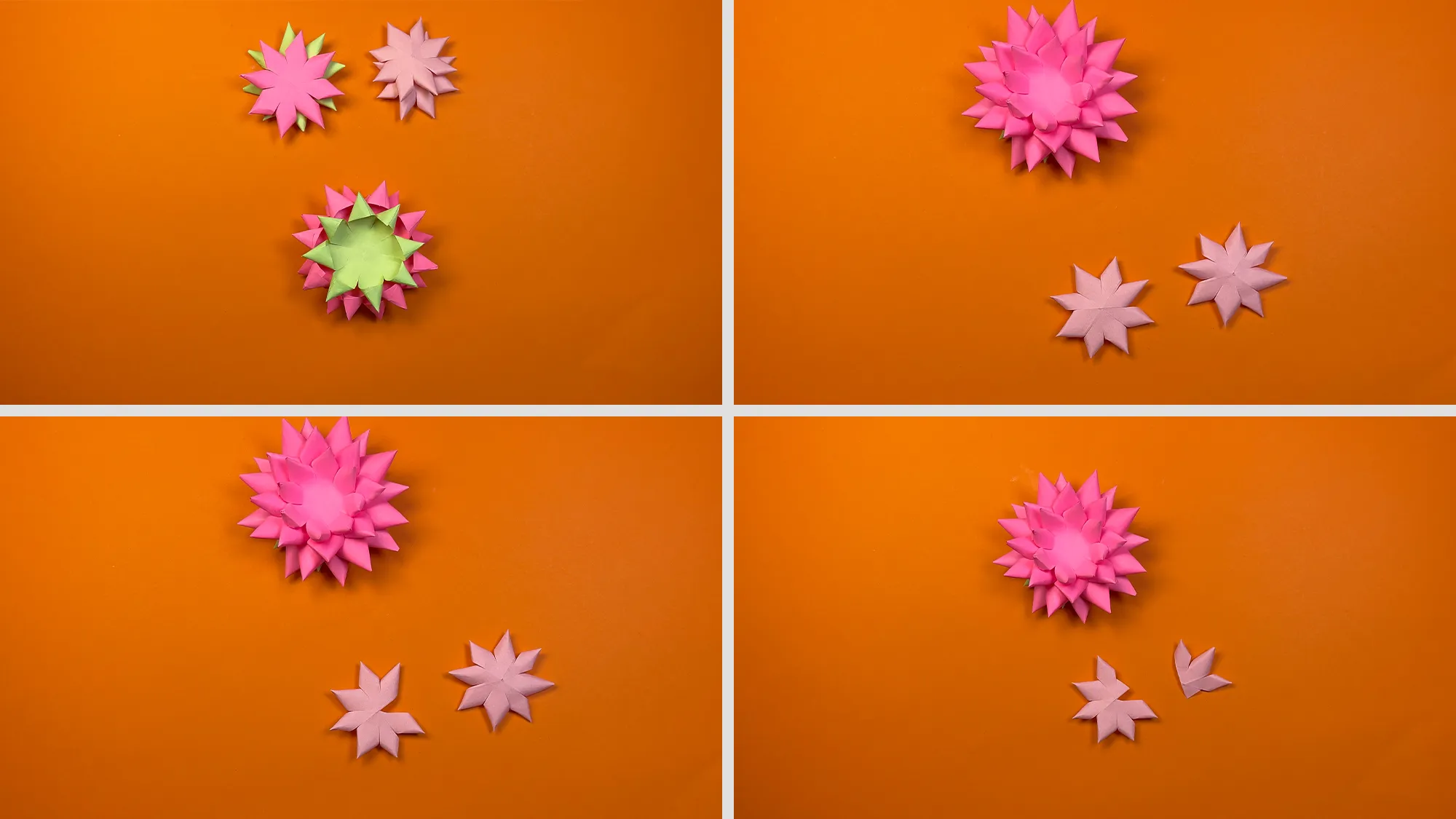Çiçeği bir araya getirmeye, yıldız katmanlarını üst üste koyarak başlıyoruz. Farklı pembe tonları derinlik efekti yaratıyor. Ayrıca, gelecekteki yapraklar için bir temel oluşturan yeşil bir parça ekliyoruz.