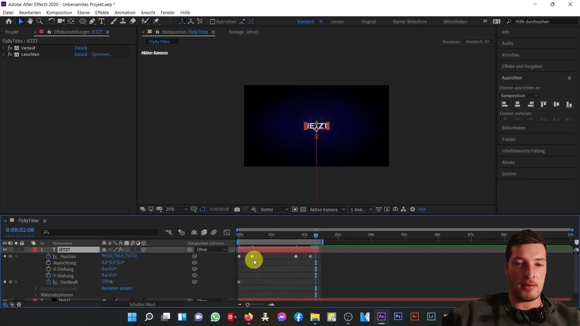Şimdi metninizi anime etme zamanı geldi. Pozisyon ve opaklık için kronometreyi etkinleştirin. Metin katmanınızın 3D katman olarak etkin olduğundan emin olun, böylece Z pozisyonunu anime edebilirsiniz.