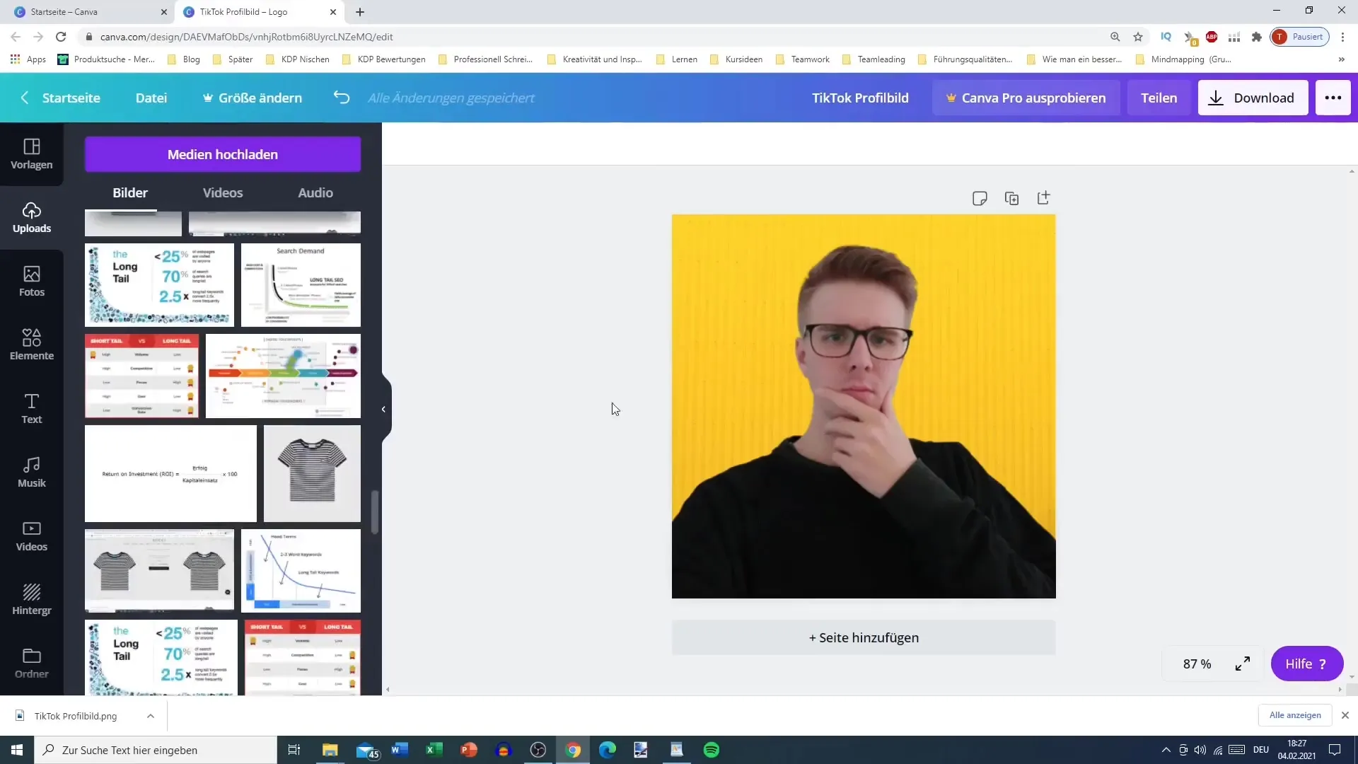 Şimdi kendinizin bir resmini seçebilirsiniz. Arka planın tek renkli olduğundan emin olun ve sizi belirgin şekilde ayırdığından emin olun. Canva'nın size sunduğu hazır şablonlardan bazılarını da kullanabilirsiniz. Kendi yüklemelerinize giderek kendi fotoğrafınızı yükleyebilirsiniz.