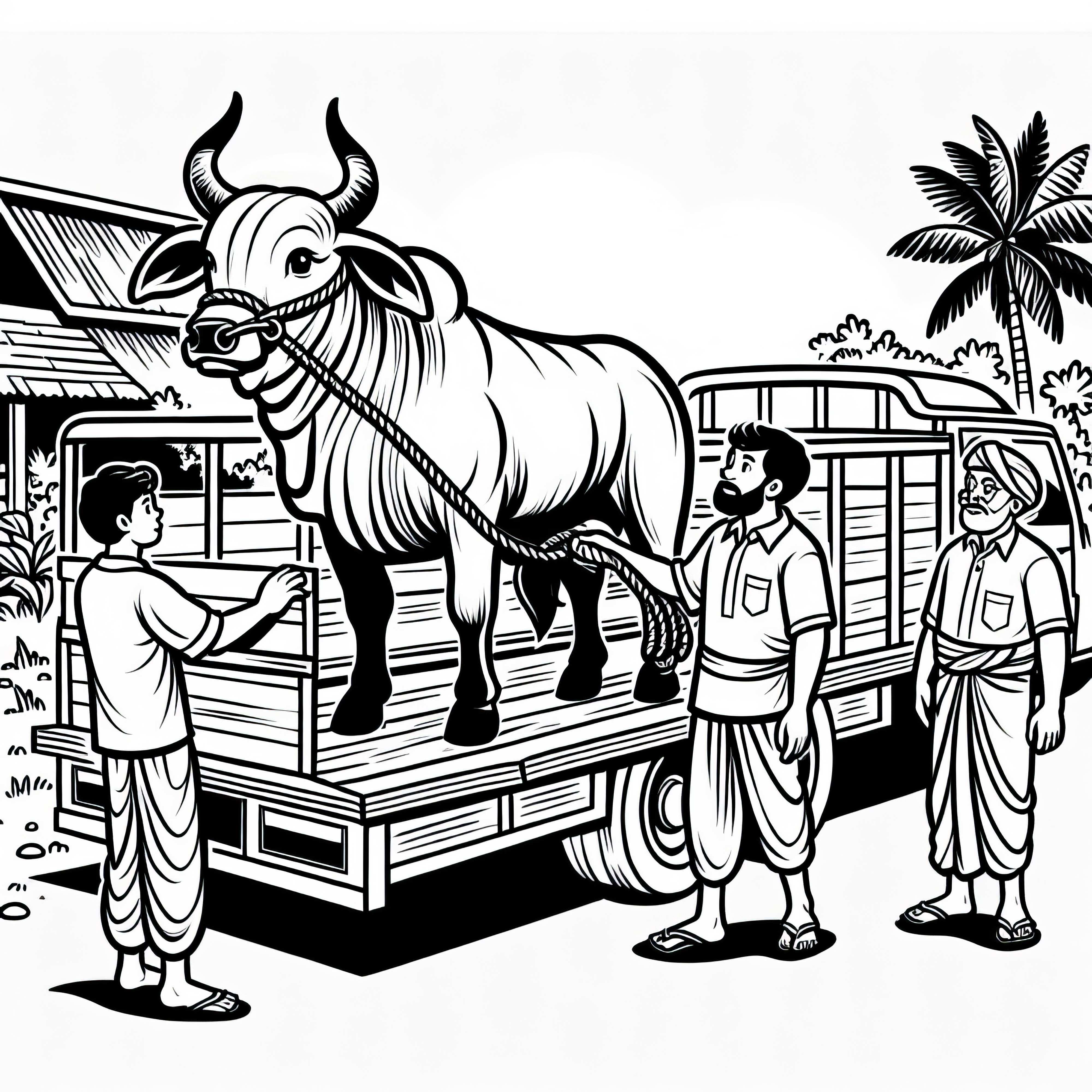 Boğa çiftçiler tarafından römorkta götürülüyor - Ücretsiz boyama sayfası