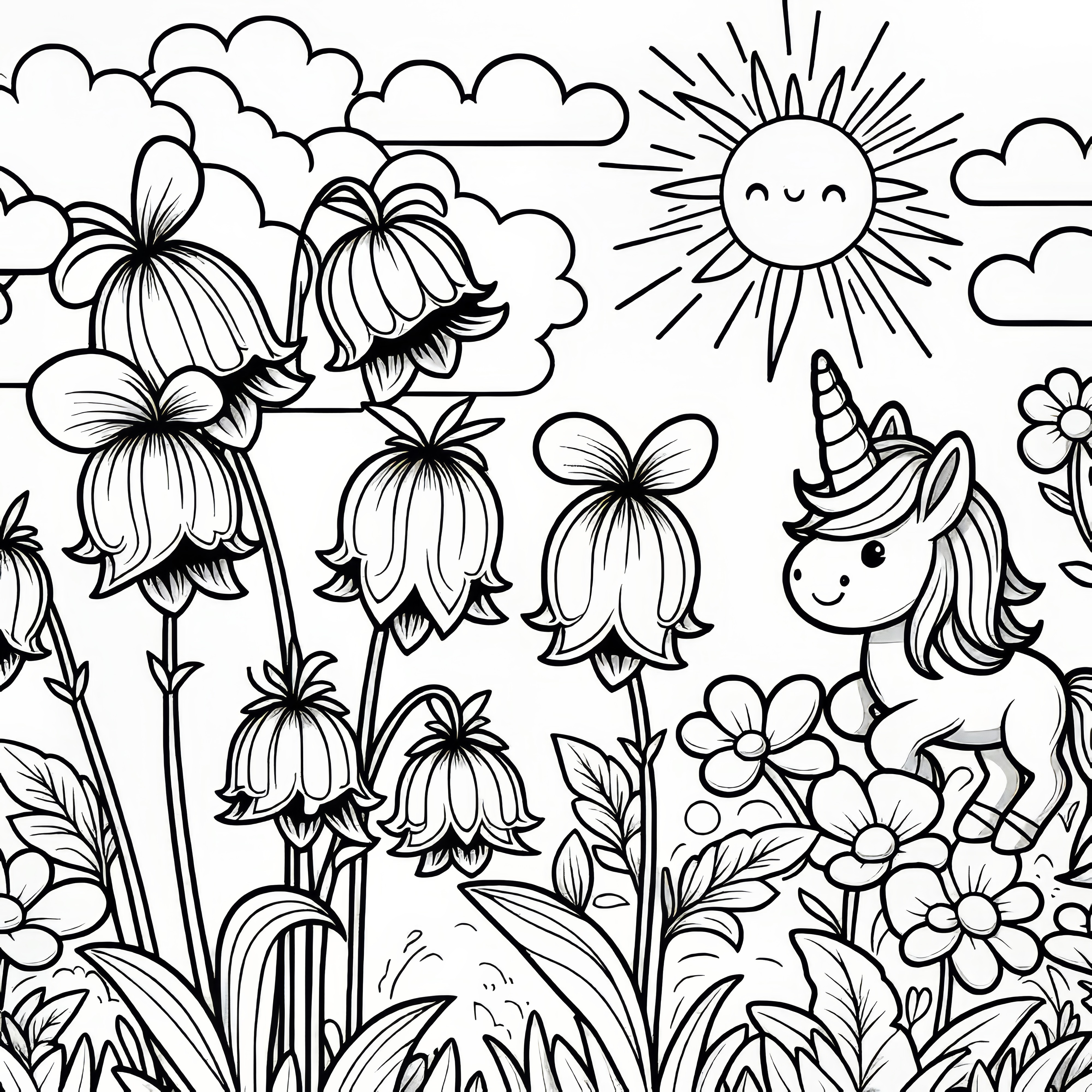 Çan çiçeği çiçekler, tek boynuzlu at ve parlayan güneş: Çocuklar için boyama sayfası (Ücretsiz)