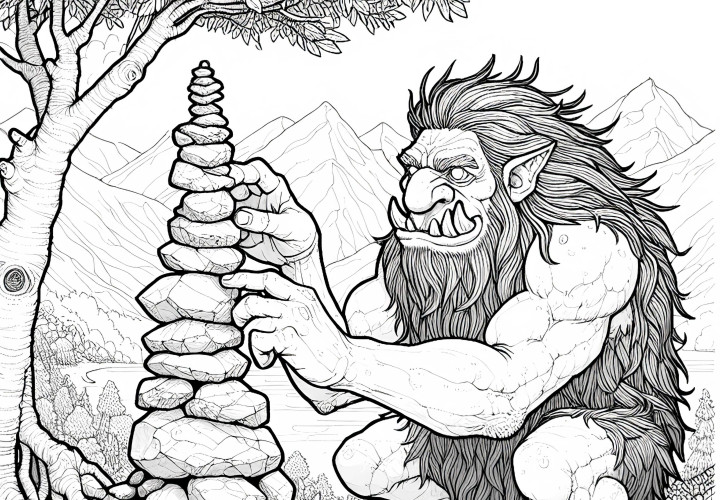 Troll, bir yolu kapatmak için büyük bir kayayı kaldırıyor: İndirilebilir (Ücretsiz) boyama kitabı