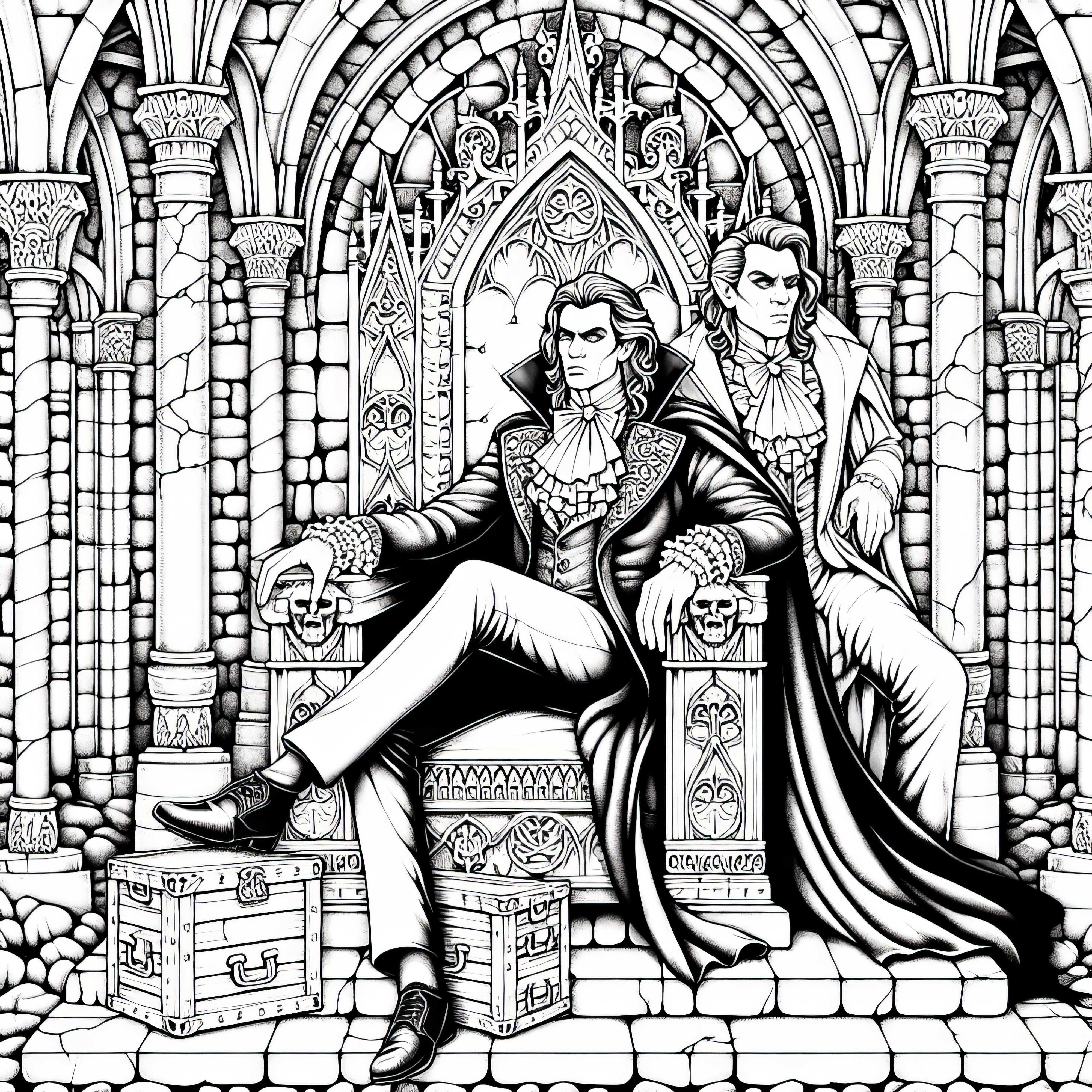Vampir, süslü oyma işleriyle bezeli tabutunda dinleniyor: Detaylı boyama şablonu (Ücretsiz)