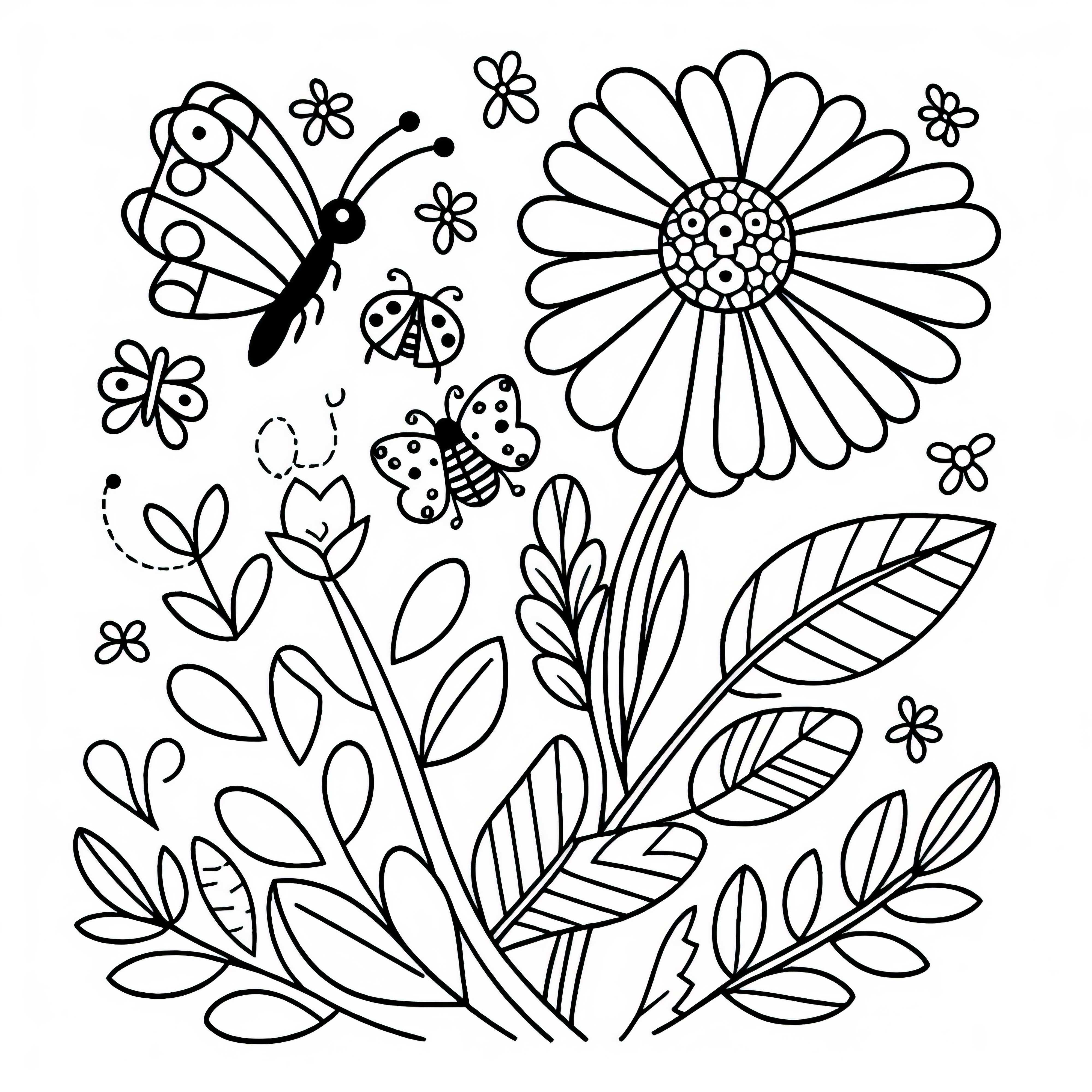 Büyük çiçek etrafında vızıldayan böcekler - Ücretsiz boyama sayfası
