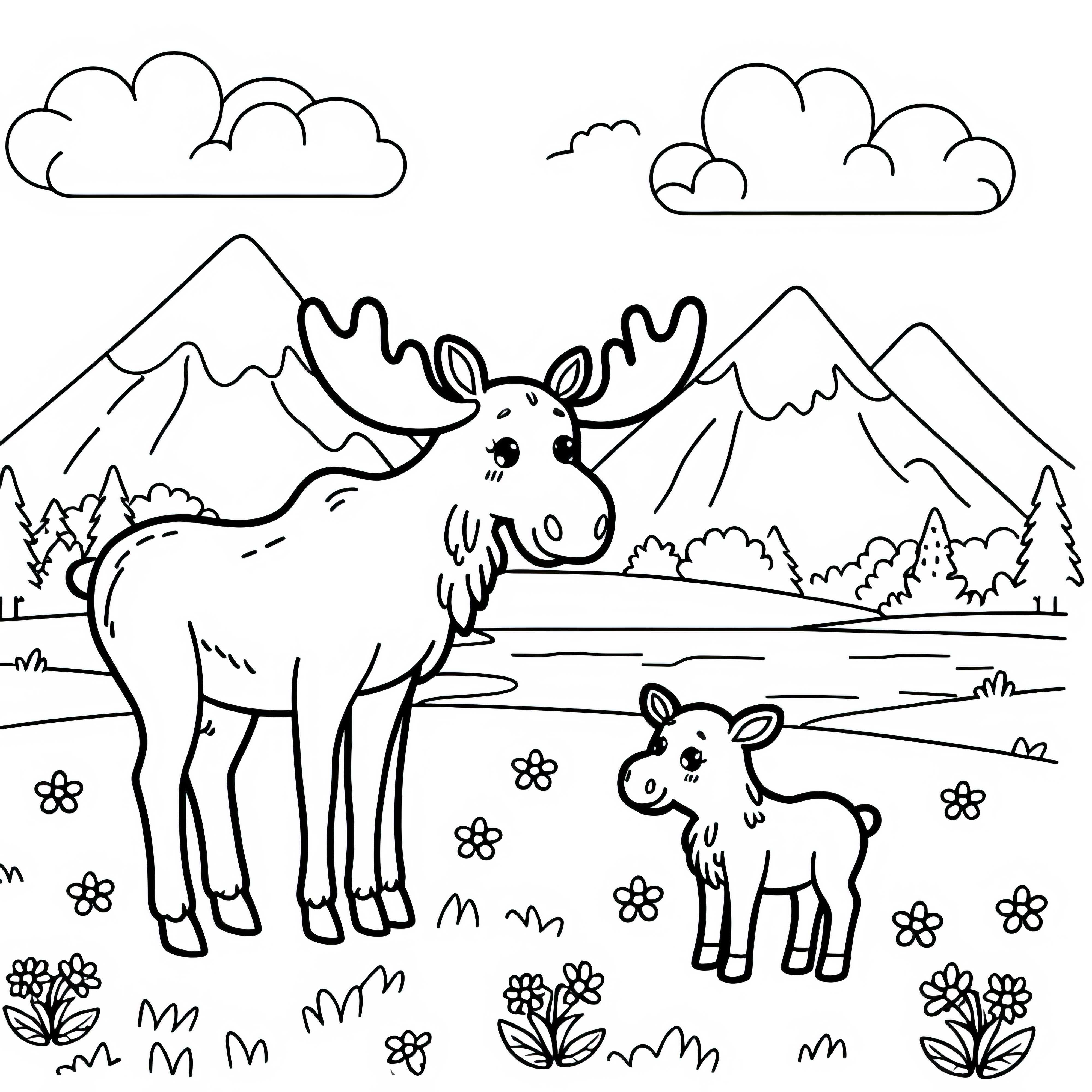 На цьому зображенні ви бачите маму лосяз її малюком, які розслаблено стоять на галявині. Це розмальовка надає вам можливість оформити сцену на свій смак. Ви можете завантажити її безкоштовнота розмальовувати у задоволення. Також онлайн у вас є можливість оформити зображення за власними бажаннями. Завантажте розмальовку зараз і починайте відразу!