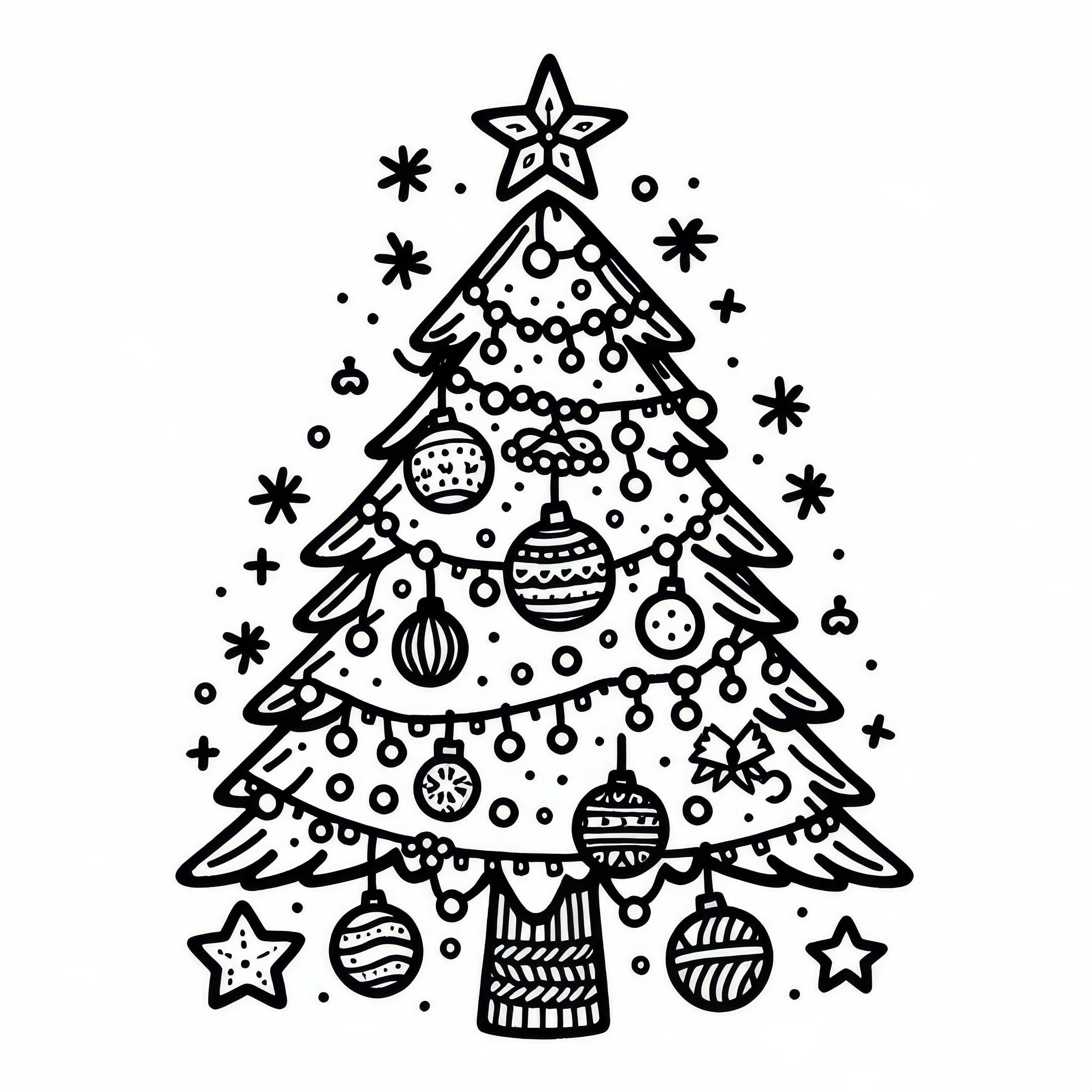 24 грудня: Святой Миколай з мішком подарунків перед прикрашеною ялинкою – малюнок для розмальовки на адвент-календарі