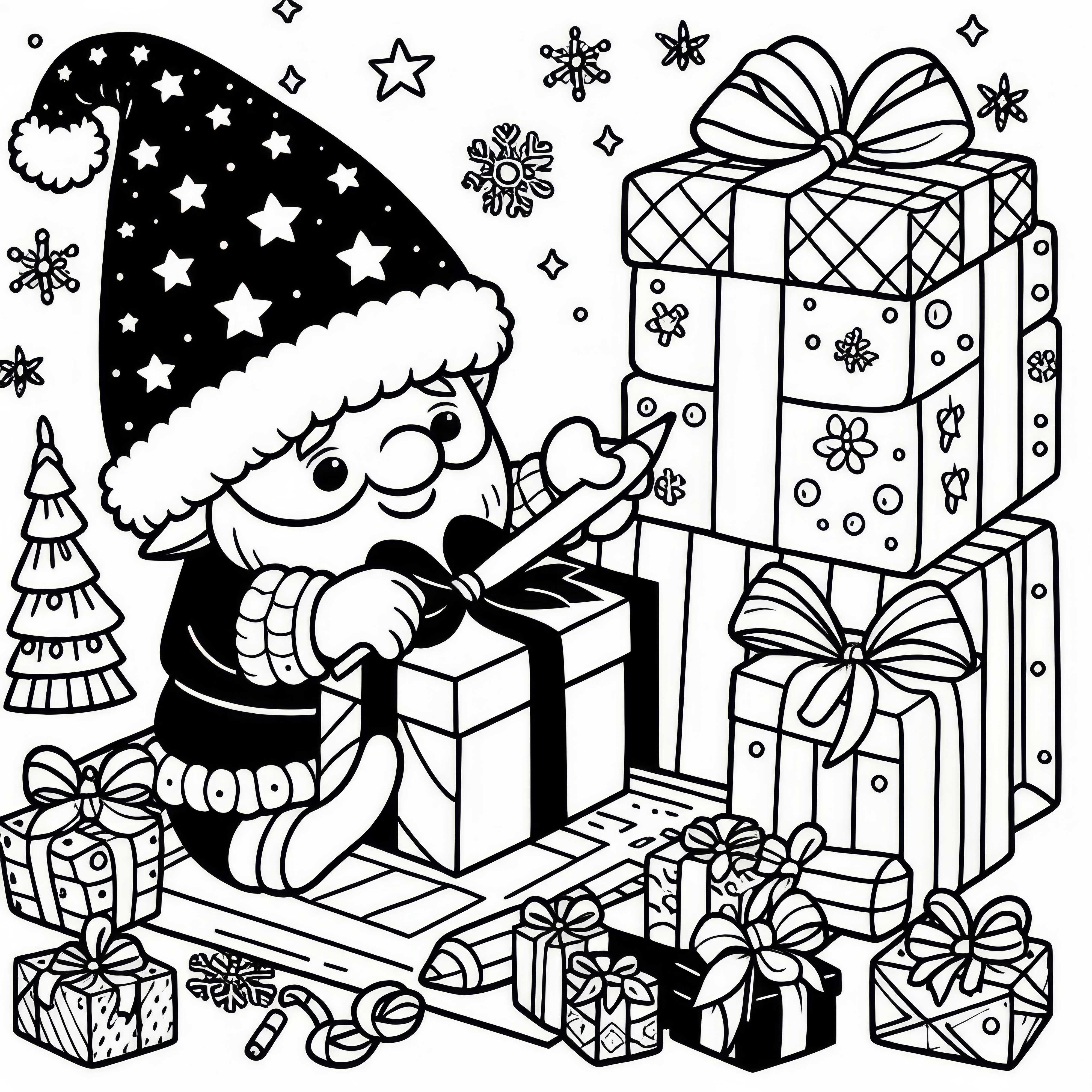 Гномик з шапкою-кивиком під час упаковки подарунків – малюнок для розфарбовування для адвент-календаря