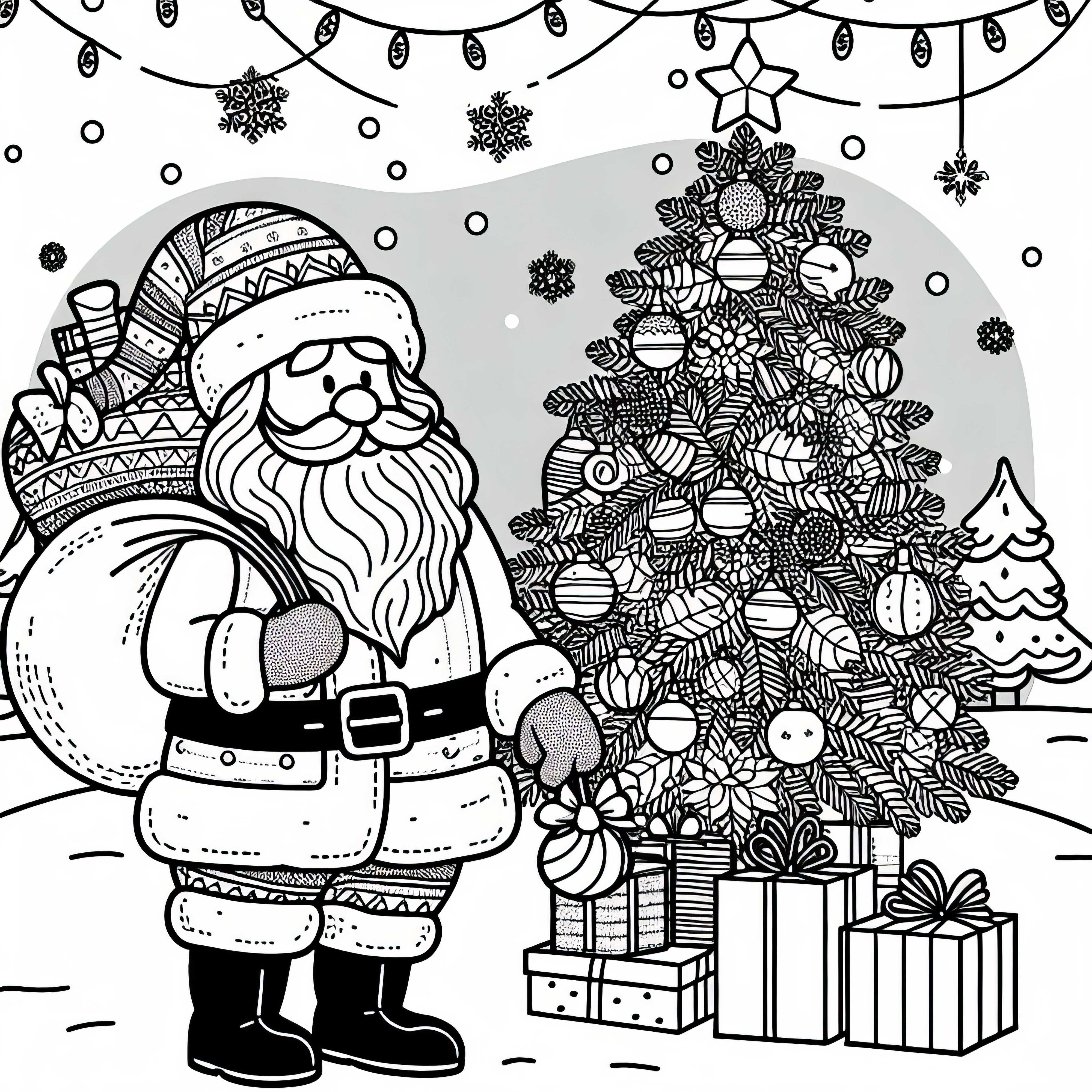 24 грудня: Святой Миколай з мішком подарунків перед прикрашеною ялинкою – малюнок для розмальовки на адвент-календарі
